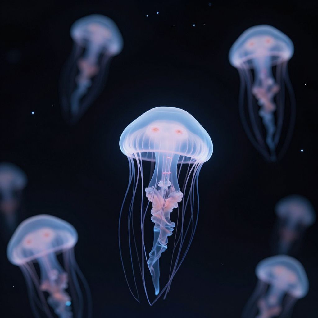 In a hauntingly serene 3D-rendered scene, ethereal jellyfish with human faces drift gracefully through a starless abyss, their translucent forms illuminated by a soft, otherworldly glow, evoking a sense of mystery and cosmic wonder.