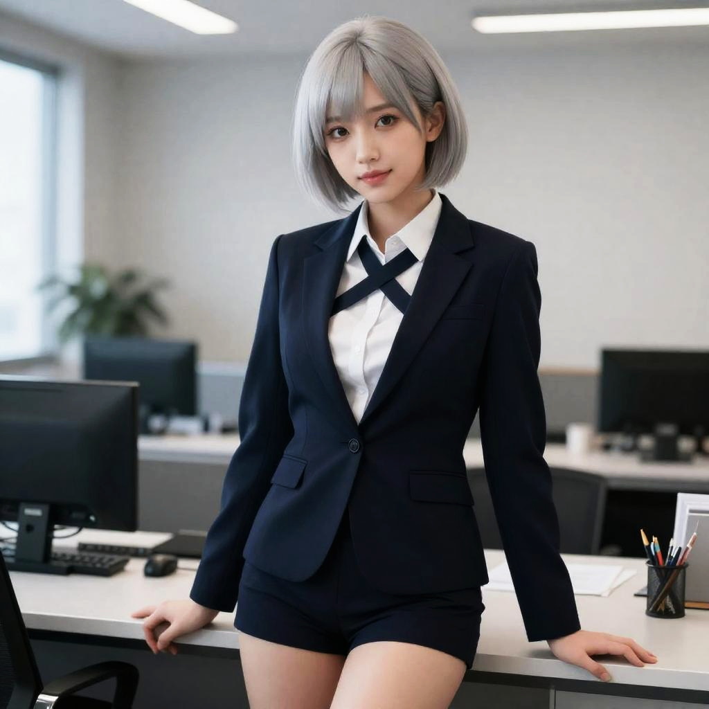 (RAW photo, best quality), (realistic, photo-realistic:1.3), masterpiece, an extremely delicate and beautiful, extremely detailed, CG, unity, 2k wallpaper, Amazing, finely detail, light smile, extremely detailed CG unity 8k wallpaper, huge filesize, ultra-detailed, highres, absurdres, soft light, (((short hair:1.3), short bang, silver hair, floating hair novafrogstyle)), beautiful detailed girl, detailed fingers, extremely detailed eyes and face, beautiful detailed nose, beautiful detailed eyes, long eyelashes, light on face, looking at viewer, (closed mouth:1.2), 1girl, cute, young, mature face, (full body:1.3), (medium breasts), realistic face, realistic body, beautiful detailed thigh, (ulzzang-6500-v1.1:0.8), business suit, cross-laced clothes, collared shirt, open clothes, in office, detailed office, open cardigan, black thighhighs, miniskirt, black underwear, unbuttoned shirt