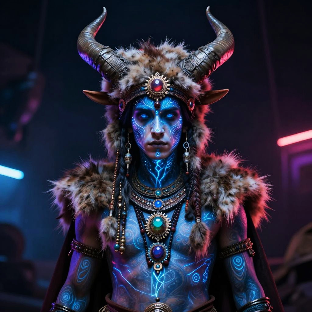 Digital art of a blue-skinned, horned humanoid with glowing tribal tattoos, adorned in fur and jewel-encrusted necklaces, illuminated by