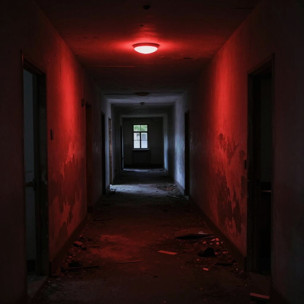Red liminal space, abandoned urban hallway with peeling paint under deep red ambient lighting, mysterious silence, scattered debris and worn textures, soft red glows from overhead fixtures, unsettling yet captivating emptiness, cinematic moody vibes