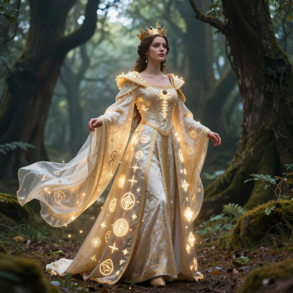 A fantasy scene featuring a royal mantle glowing with magical runes, flowing gracefully on a queen in a mysterious forest, ethereal light filtering through ancient trees, mystical ambiance