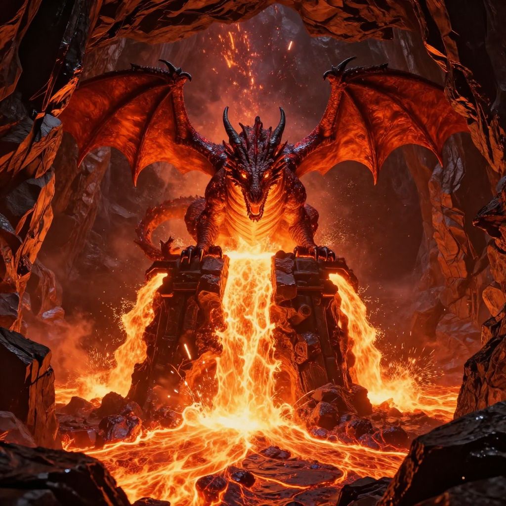 Dragon generator at work inside a volcanic cavern, streaming lava and sparks as dragons made of flowing molten rock emerge from the machine, surrounded by glowing magma pools and jagged stone pillars, intense fiery color palette and dynamic composition