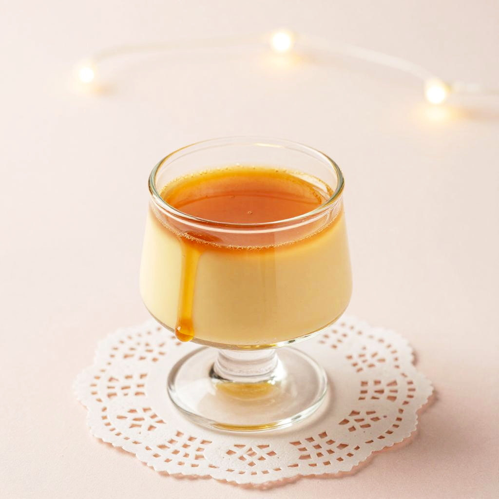 Purin custard pudding served in a delicate glass cup, silky smooth texture with caramel dripping down the sides, placed on a vintage lace doily, soft pastel background, dreamy bokeh lights, intricate details in food presentation, inviting and warm.