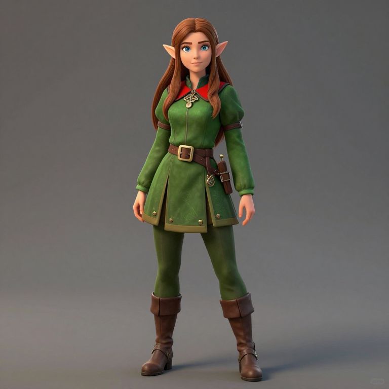 Female elf with long brown hair, wearing a green outfit with a red collar and brown boots.