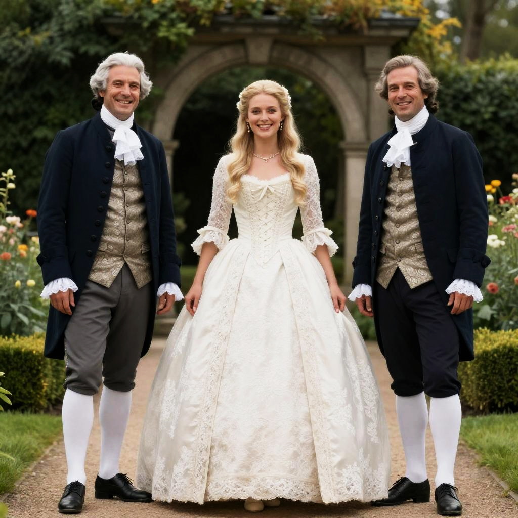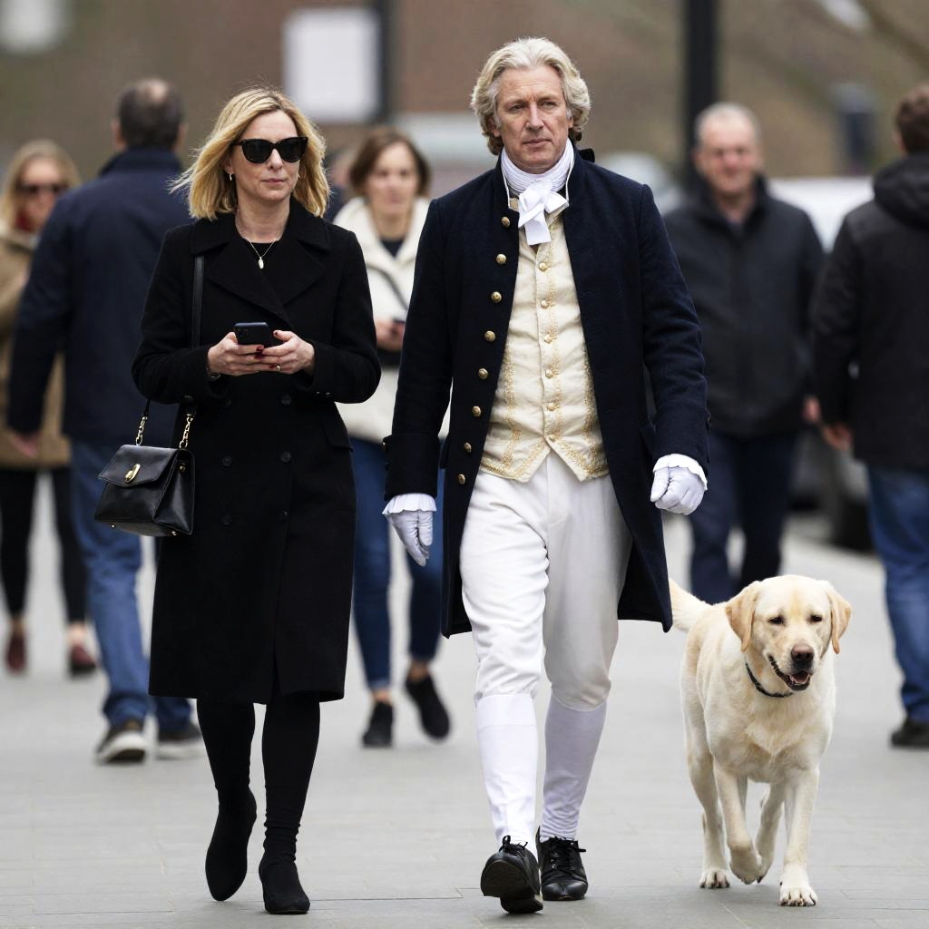 Photograph of a street scene. A man in an 18th-century-style outfit with white pants, black coat, and gold-trimmed waistcoat, walks a yellow Labrador. A blonde woman in a black coat, sunglasses, and holding a bag and phone, walks beside him. Background includes several people in casual and formal attire, blurred urban setting.