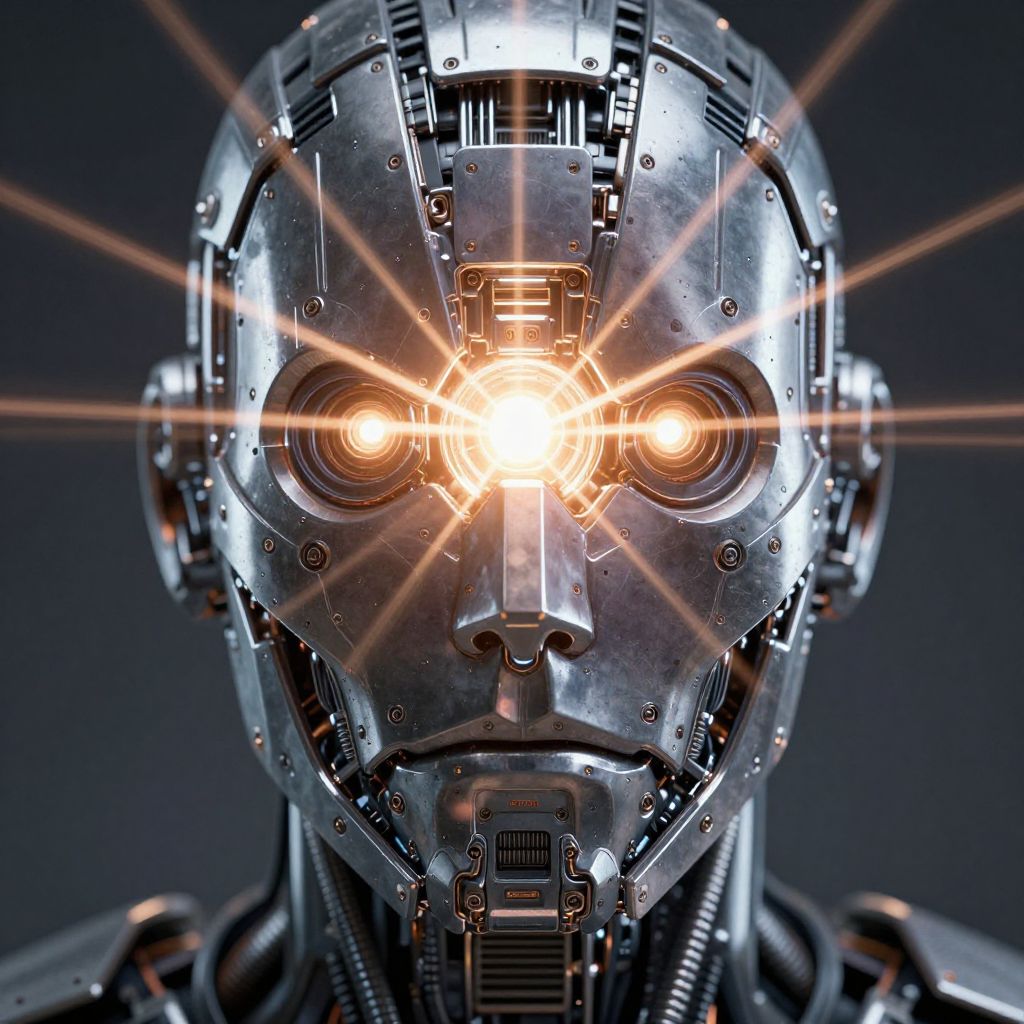 Reactor face model, robotic humanoid with reactor core centered in the forehead, emitting radiant energy beams, intricate metal plates and wires forming facial contours, futuristic and powerful, ultra-detailed, cinematic sci-fi illustration