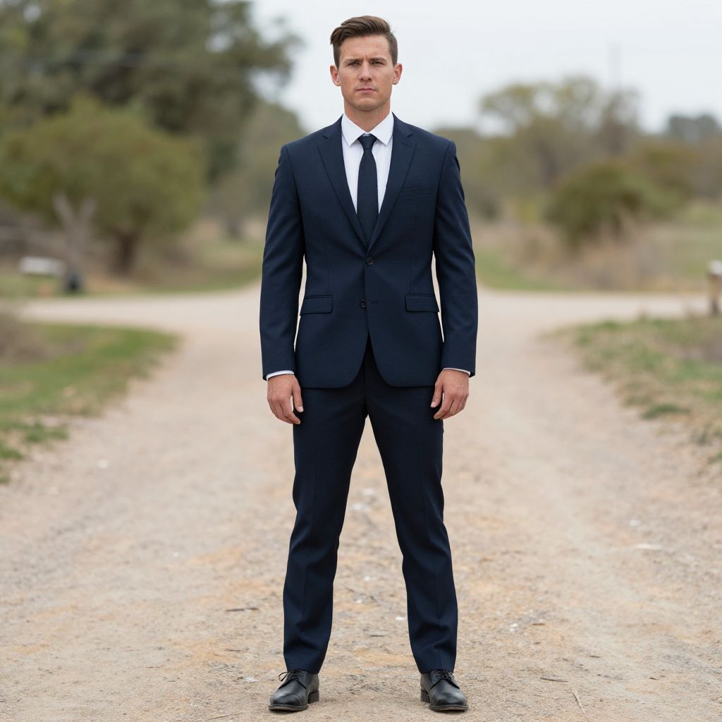Photograph of a tall, handsome man in a navy suit, white shirt, and black tie standing confidently on a gravel path. Background features blurred green