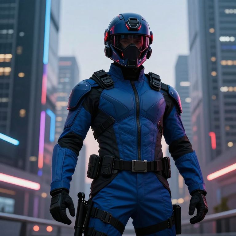 A person wearing a blue and black tactical outfit with armored pants, a fitted blue jacket, and black gloves, standing in a futuristic cityscape at dusk, a dark blue helmet with glowing red accents on their head, the helmet partially covering their face, eyes visible through the visor, giving a serious and focused expression, dynamic lighting with neon reflections on the city buildings, cinematic composition, high detail, realistic style.