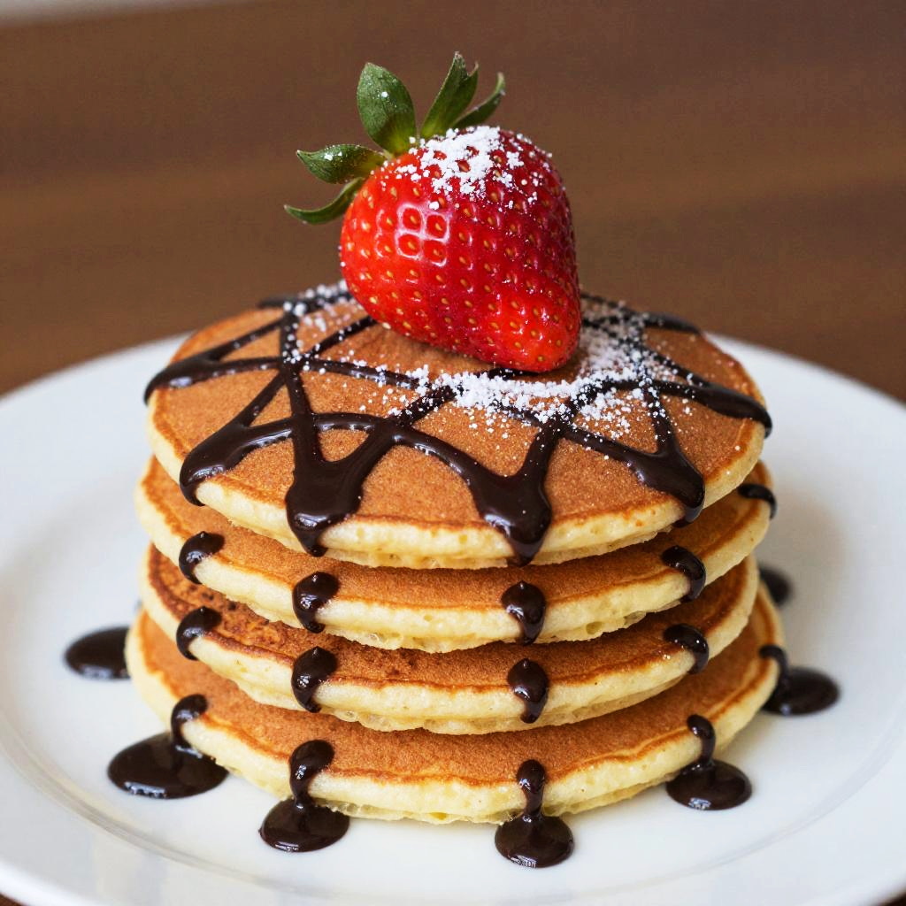 A close-up photo of a stack of four golden-brown pancakes, drizzled with dark chocolate syrup. A fresh, red strawberry with green leaves sits on top, lightly dusted with sugar. The pancakes are on a white square plate, against a warm, blurred brown background. The image has a vibrant, high-contrast style, making the textures of the pancakes and strawberry pop.