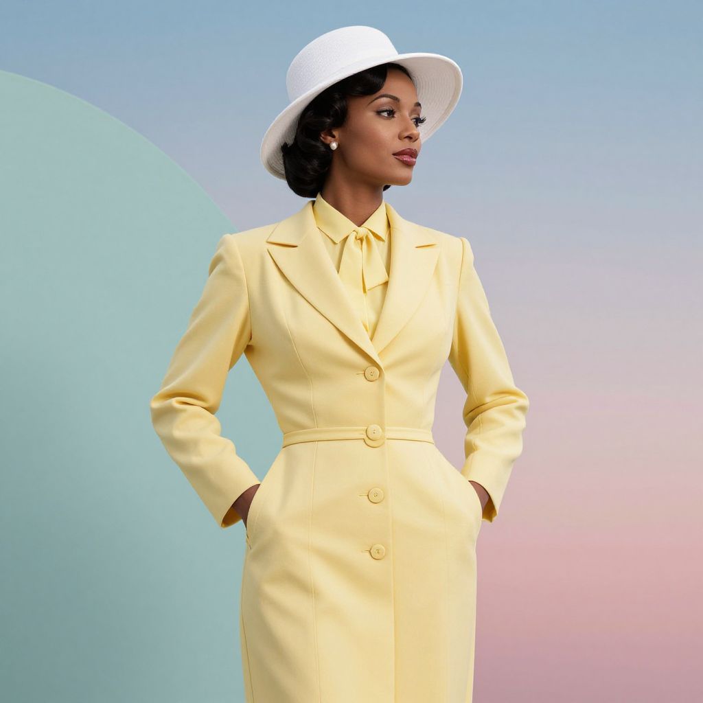 In this vintage vogue photoshoot, an editorial from the 1940s, a glamorous African American woman exudes elegance in a pastel yellow travel suit. The suit, characterized by its structured shoulders and tailored fit, is adorned with a matching yellow blouse and a crisp white hat, adding a touch of sophistication. The woman's hands are playfully tucked into her pockets, accentuating the suit's classic design. The background, a harmonious blend of pastel colors, features a large, curved structure that complements the overall aesthetic. The sky, a soft gradient of blues and pinks, creates an atmospheric backdrop, enhancing the vintage feel of the scene. The high resolution and detailed textures of the suit, hat, and background elements contribute to the image's timeless appeal, capturing the essence of 1940s glamour.