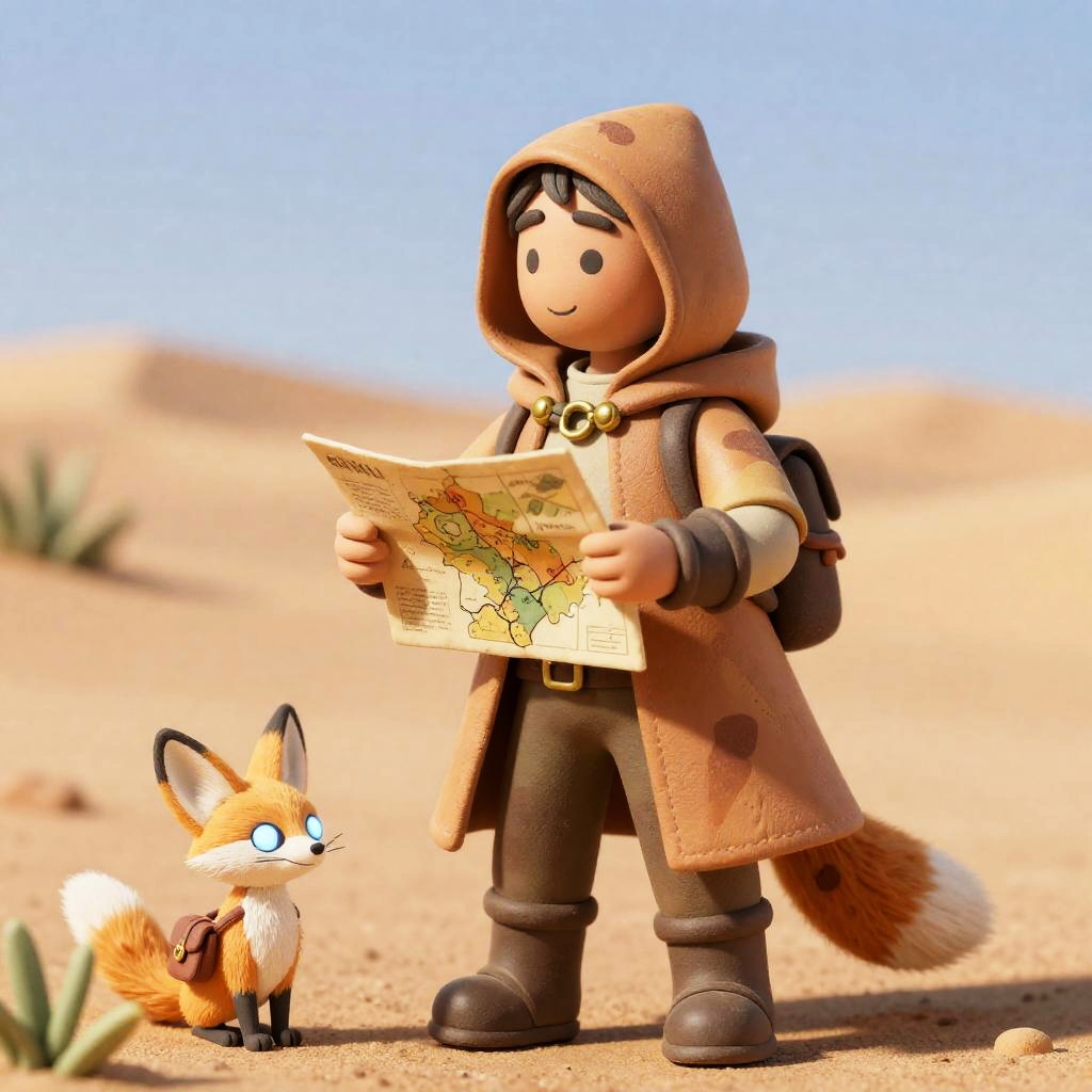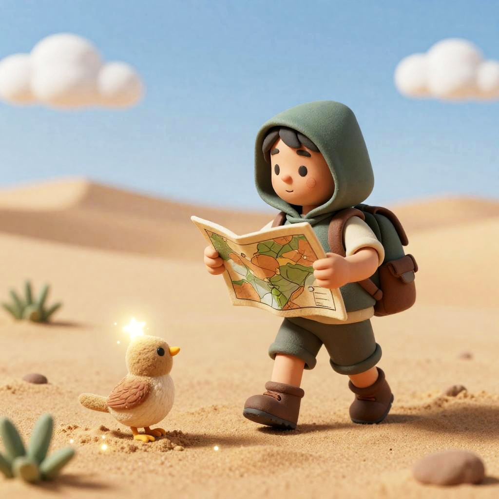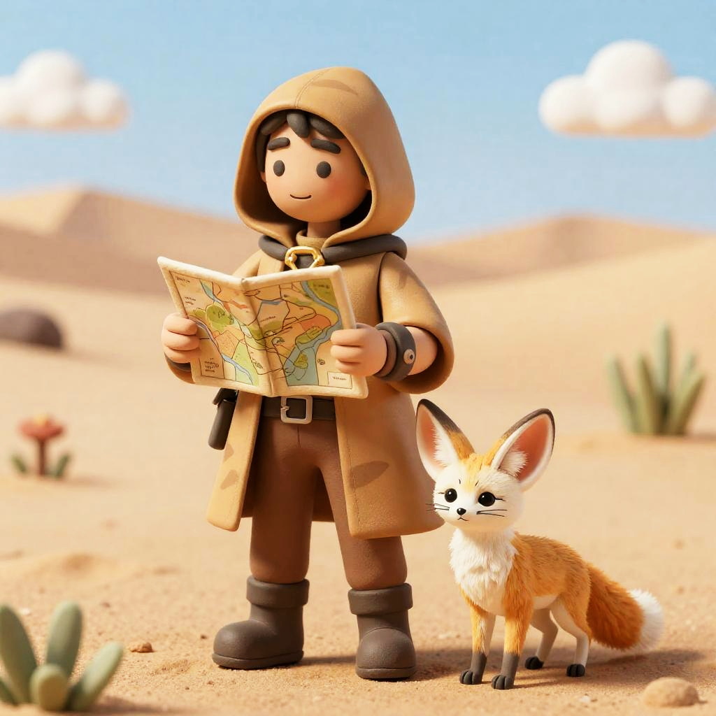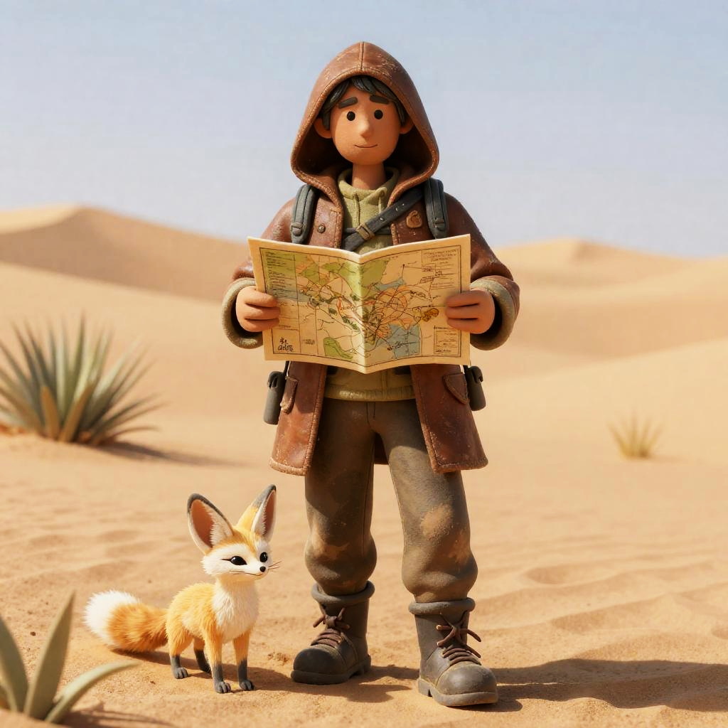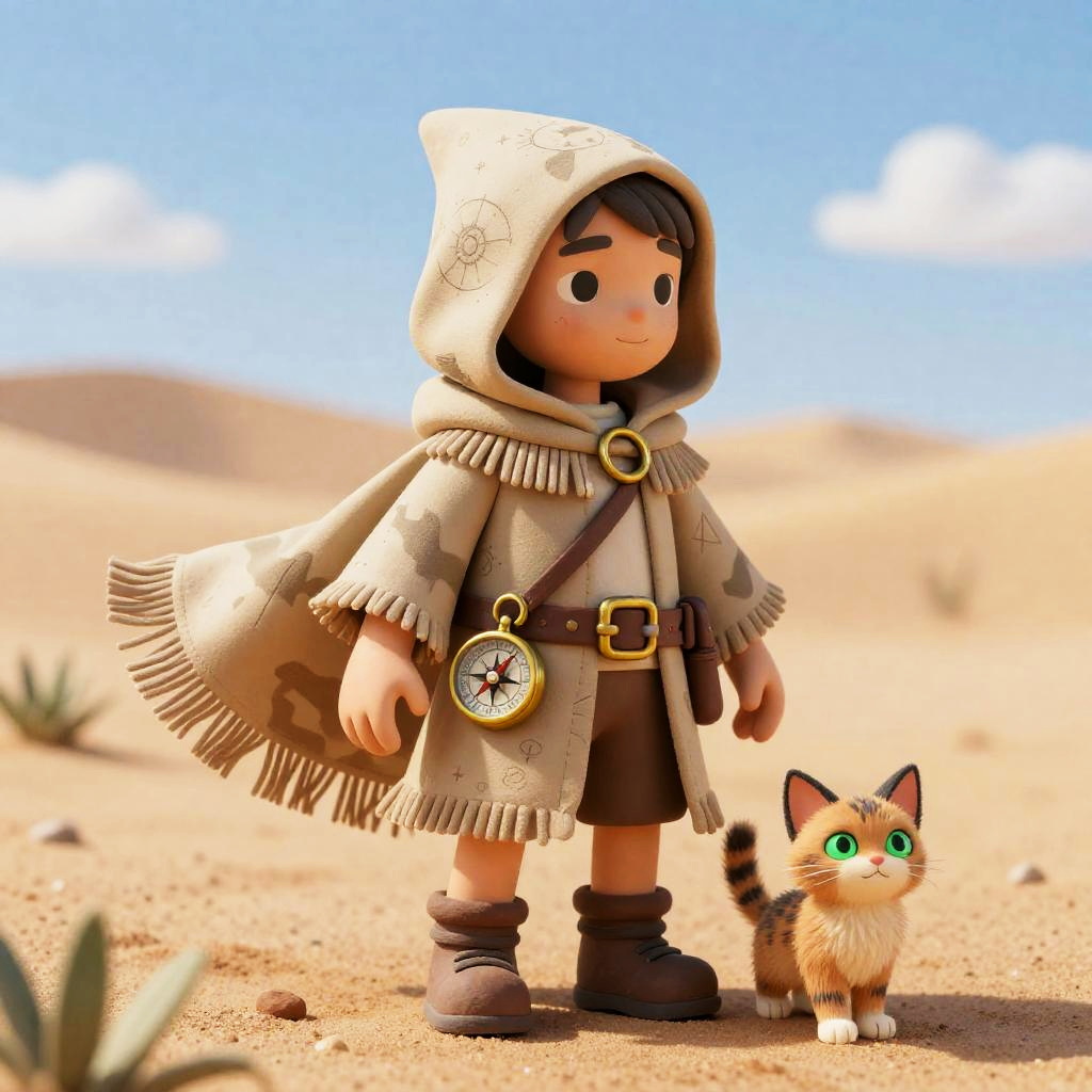 A scout, traveling through the sandy desert, very brave, wearing a hooded desert-stone suede cloak with stitched topographic contour trims, a sewn-in sunstone amulet at the clasp, sand-proof weave and tapered wind-ribbons, a topographic map, and a brave little sand owl chick (round-eyed, fluffy mottled plumage, tiny leather talon wrap, perches on the scout's gauntlet, curious and watchful), very magical and beautiful plants, Disney animation scenes, clay wind, high-quality pictures, pop mart