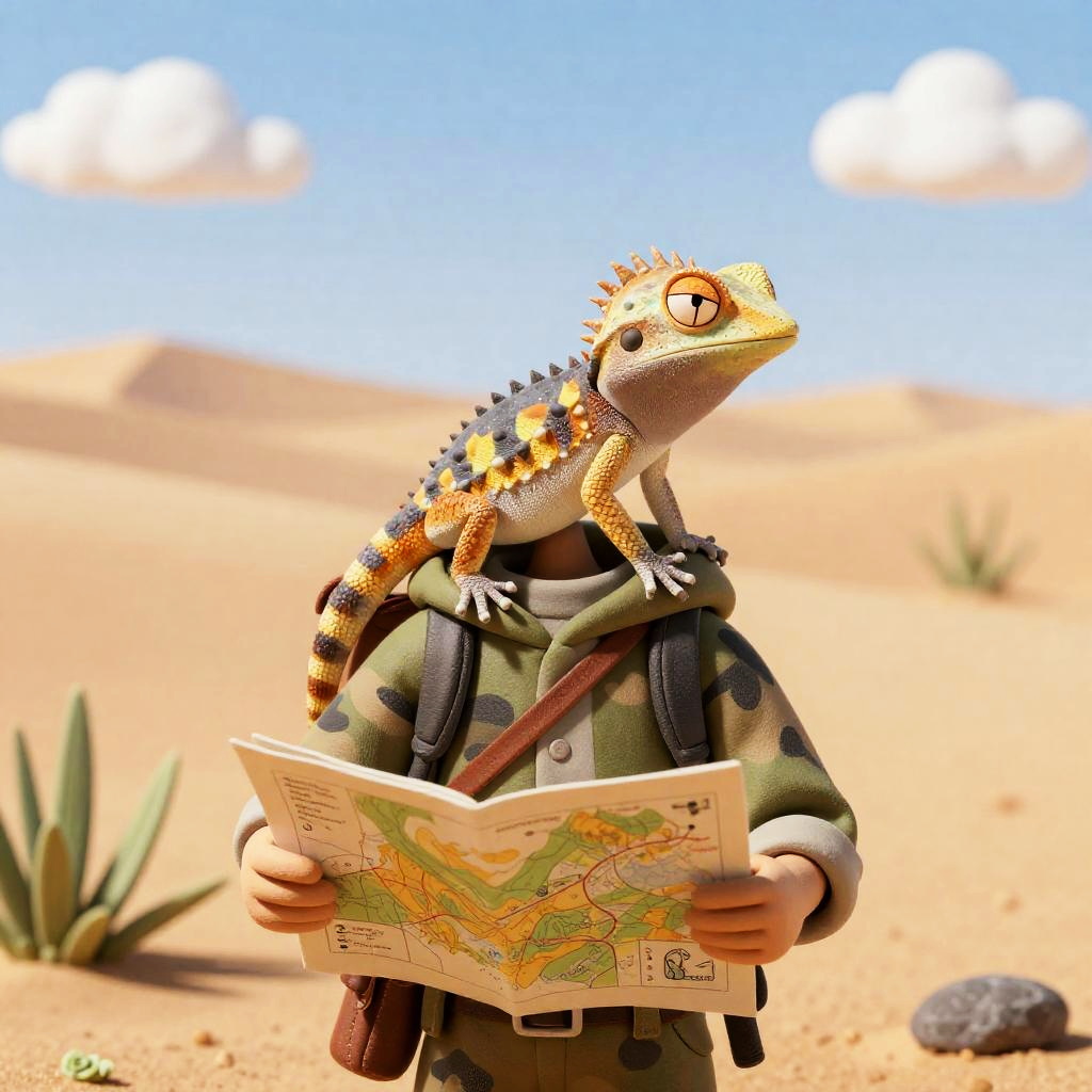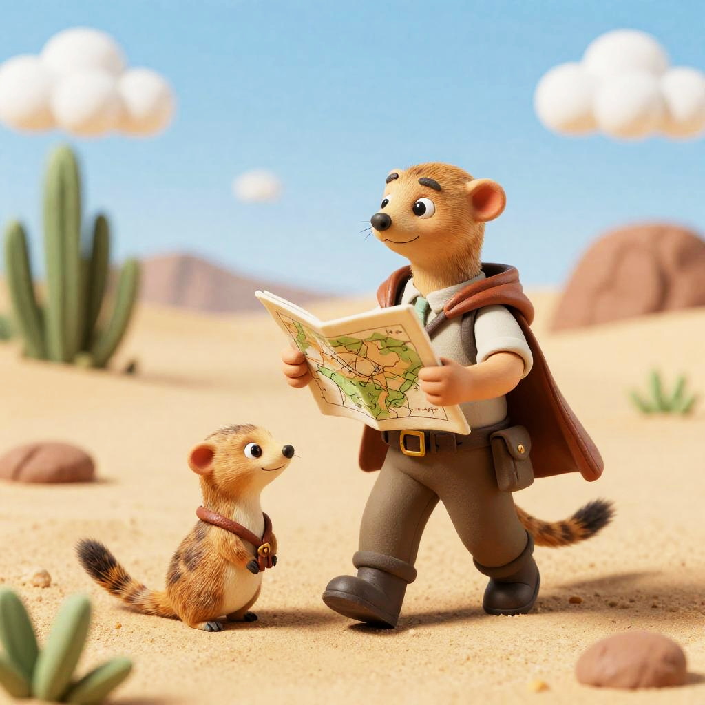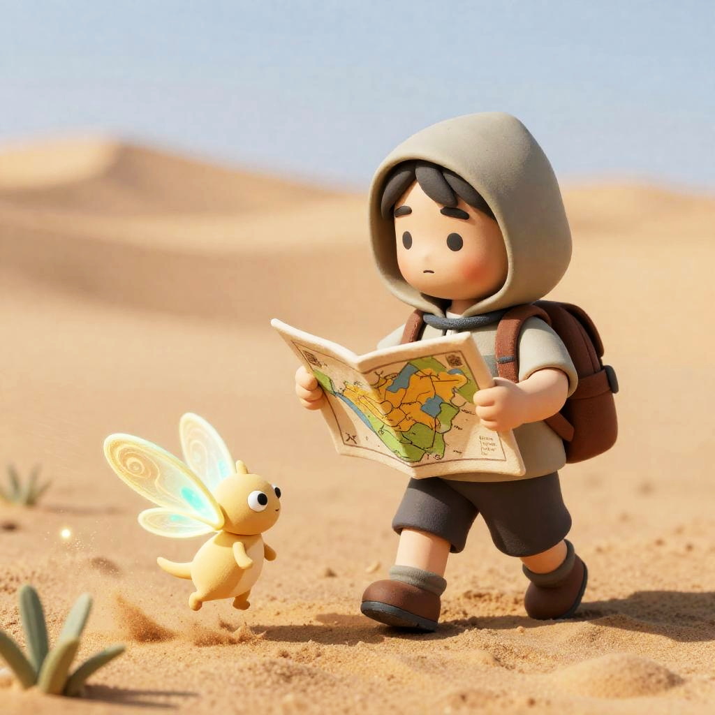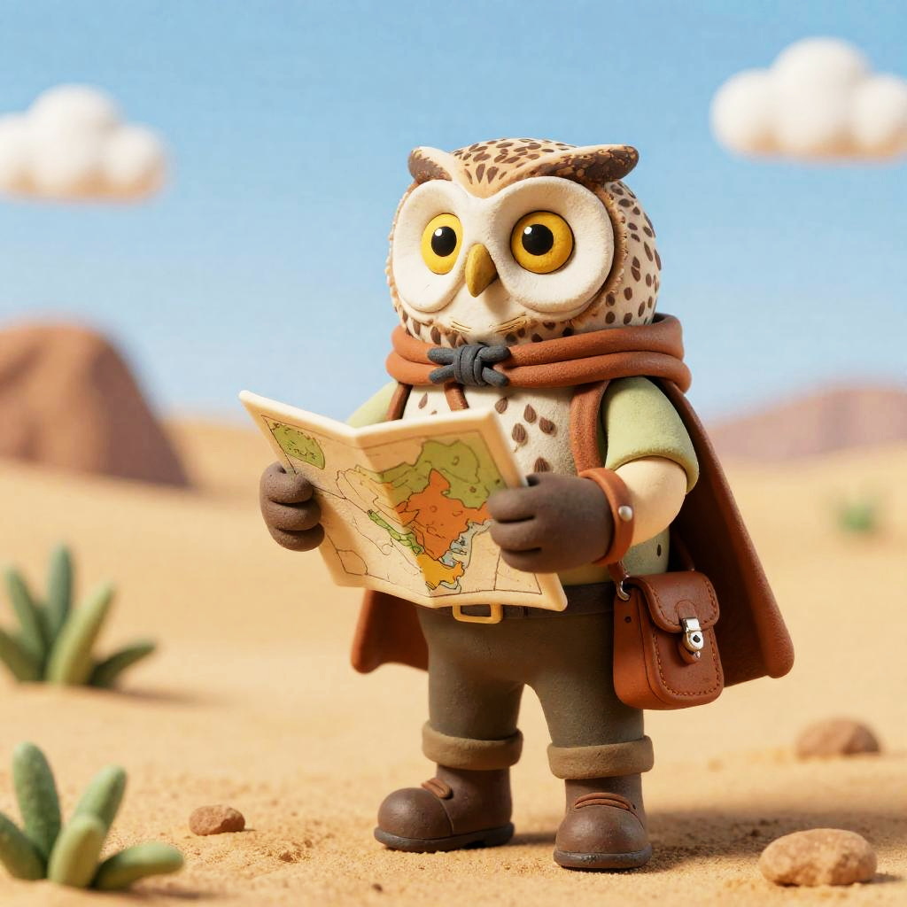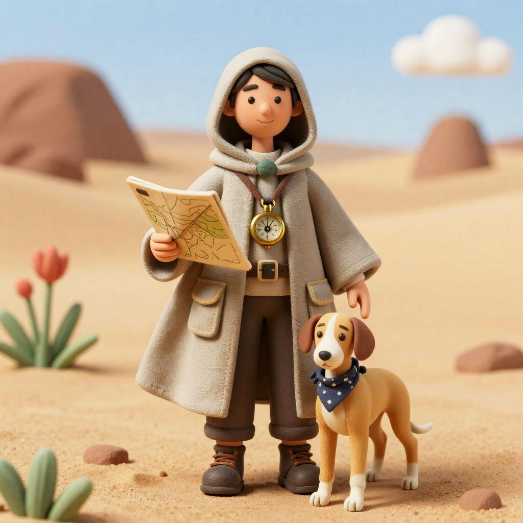 A scout, traveling through the sandy desert, very brave, wearing a hooded desert-stone suede cloak with stitched topographic contour trims, a sewn-in sunstone amulet at the clasp, sand-proof weave and tapered wind-ribbons, a topographic map, and a brave little sand owl chick (round-eyed, fluffy mottled plumage, tiny leather talon wrap, perches on the scout's gauntlet, curious and watchful), very magical and beautiful plants, Disney animation scenes, clay wind, high-quality pictures, pop mart