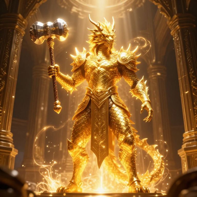 Majestic golden dragonborn paladin with glowing scales, holding a blessed hammer, surrounded by divine light, in a mystical ancient temple, high fantasy style