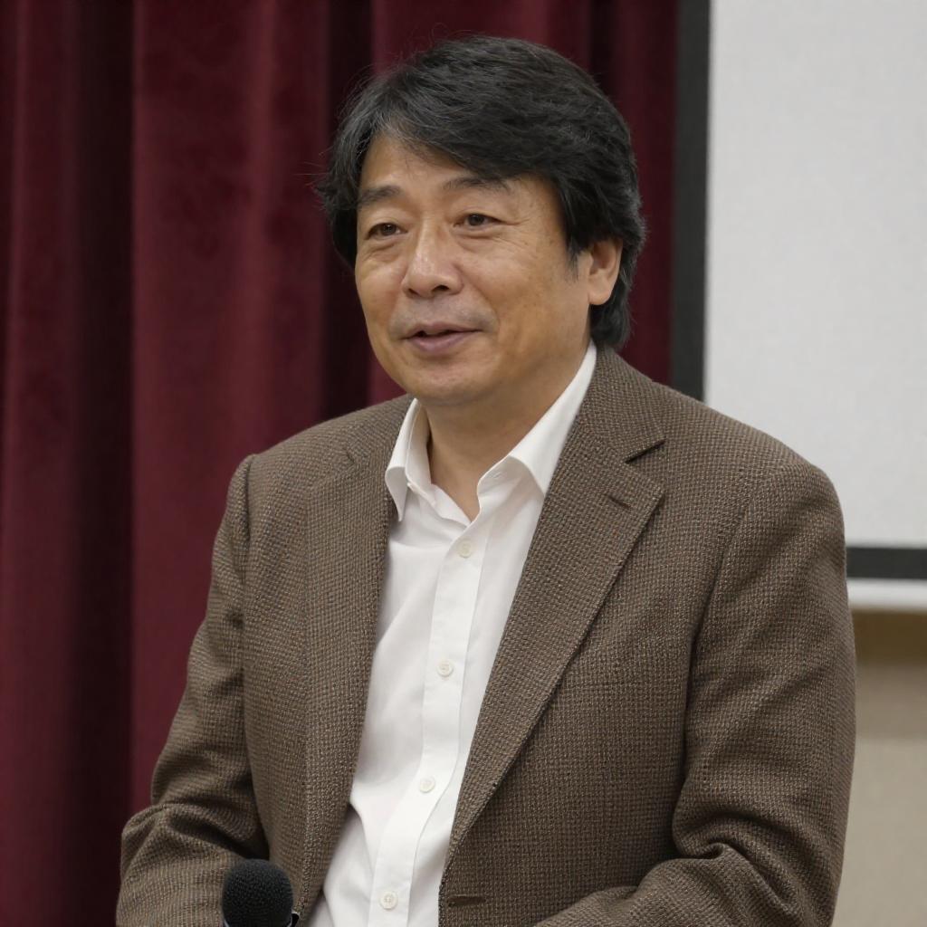 Photograph of a middle-aged man with medium-length dark hair, wearing a brown checkered blazer over a white shirt, seated indoors. He has a light complexion and is slightly smiling. The background features red patterned curtains and a white wall. He is holding a microphone, suggesting he is speaking or presenting.
