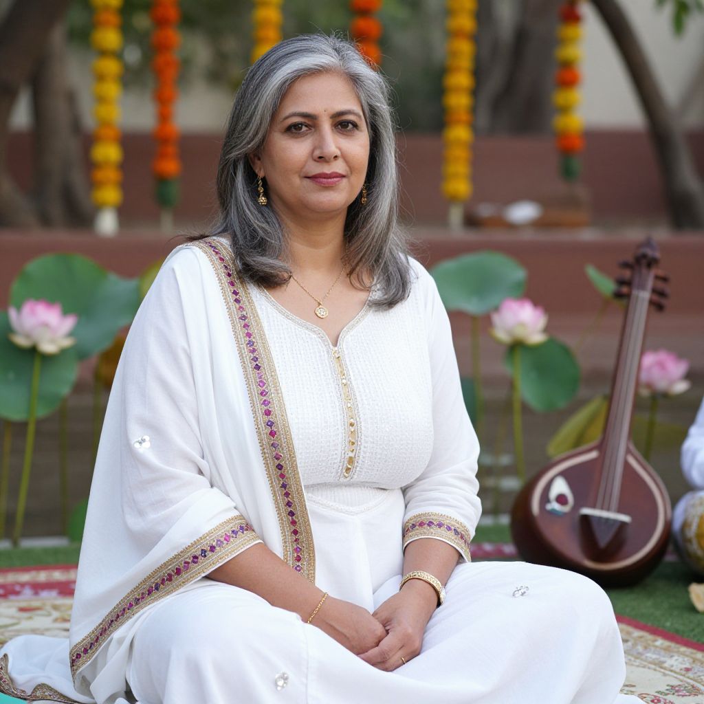 A serene middle-aged woman with kind facial features and silver-streaked hair, wearing a beautifully crafted white kameez shalwar with a traditional zari border and subtle mirror work, sitting in a garden during a festival season in Hyderabad, surrounded by lotus flowers and traditional music instruments.. The woman has big tits and cute face