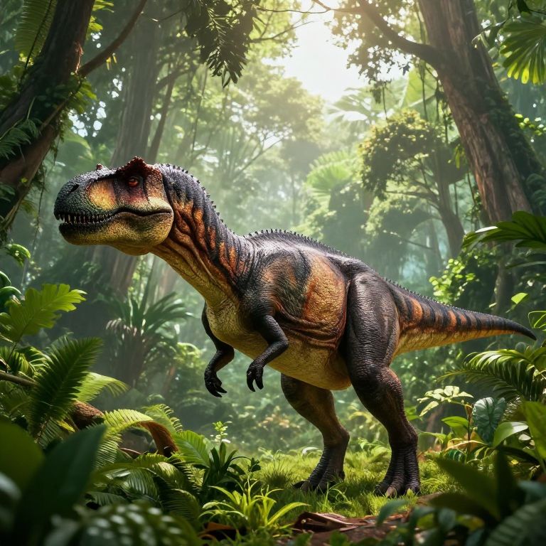 Dinosaur roaming ancient dense jungle during sunrise, vibrant lush greenery all around, mist rising, photorealistic style with high detail scales and sharp claws, large towering trees, dynamic lighting highlighting textures of dinosaur skin