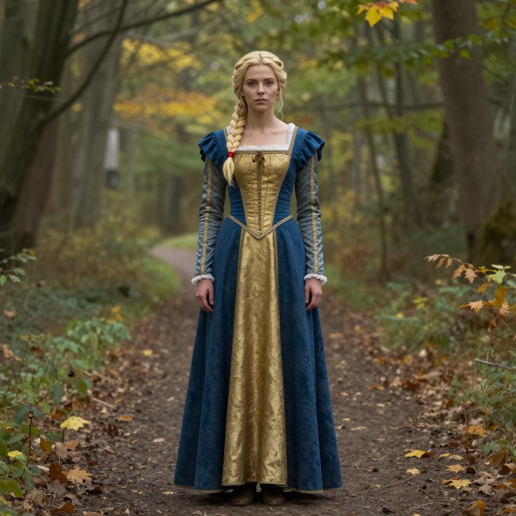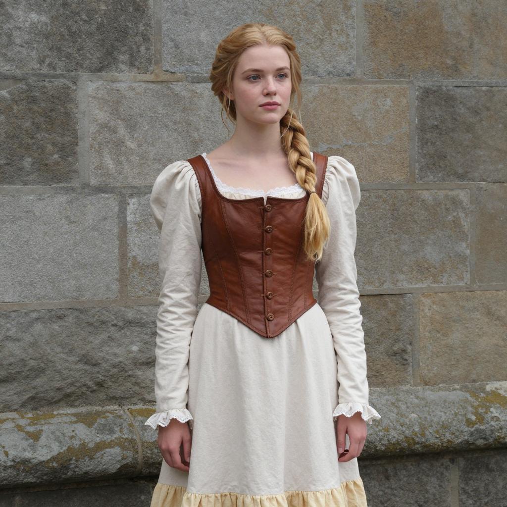 Briar rose costume woman, photorealistic portrait, young woman, long brown hair, red flower in hair, fair skin, standing, brown medieval-style dress, white puffed sleeves, red underskirt, lace-up front, autumn leaves on ground, stone wall background, orange draped cloth, soft natural light, serious expression, detailed ures, historical fashion, fall setting, realistic lighting, full body shot, outdoor scene, front view, subtle shadows