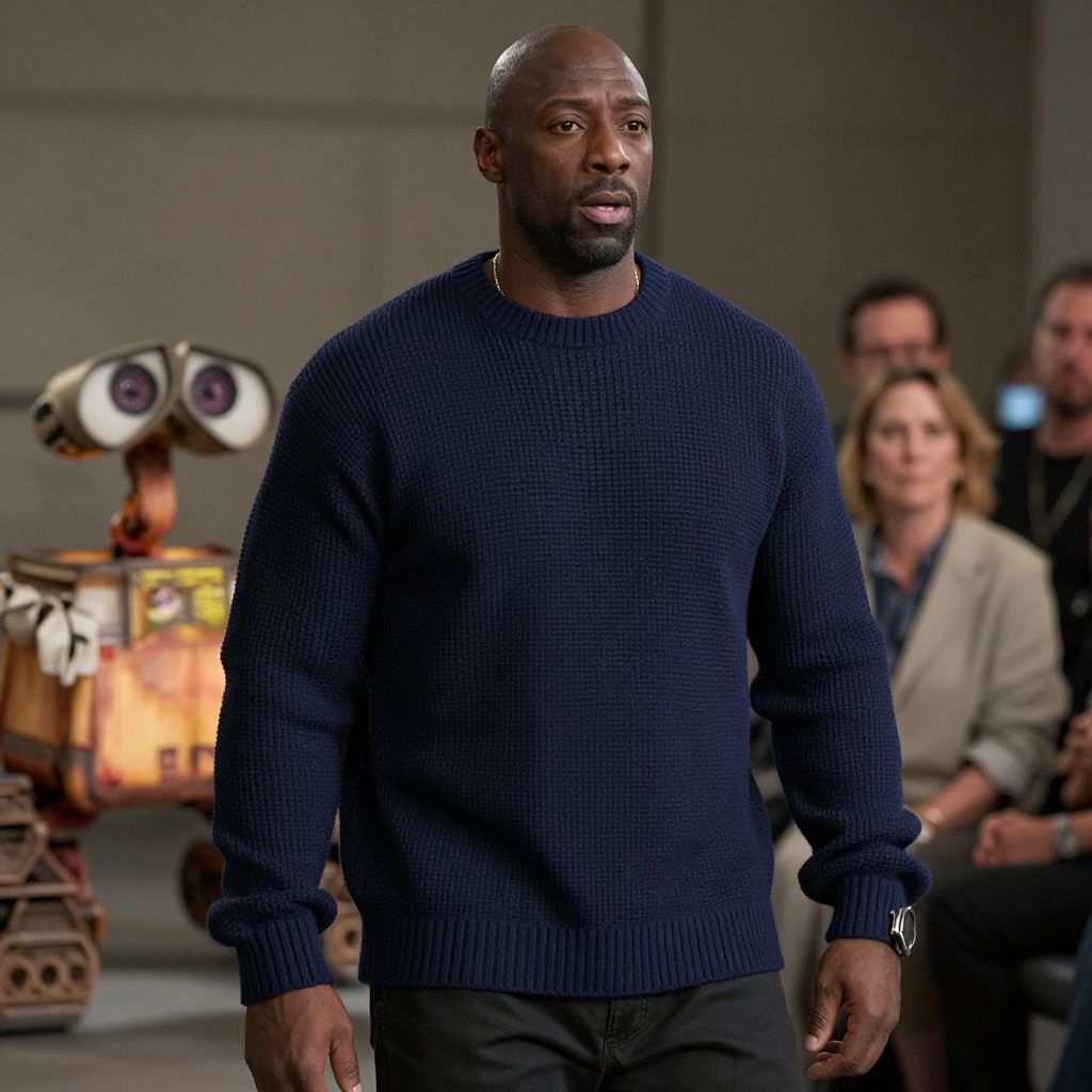 Wall-E screengrab of male model Idris Elba wearing a trendy oversized navy Balenciaga sweater, fashion movie scene, Balenciaga commercial,