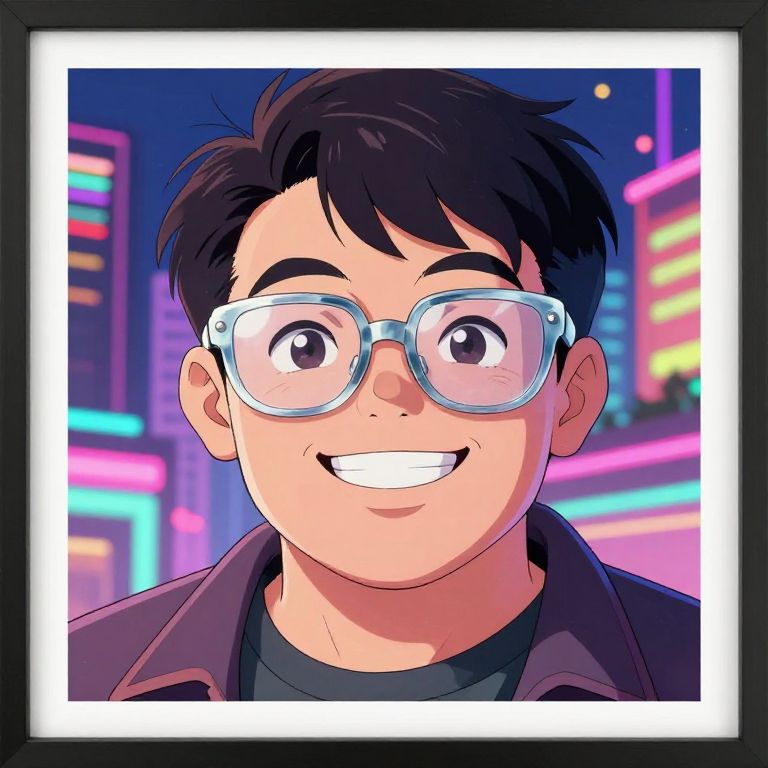 Digital anime-style portrait of a young man with short black hair, large round glasses with a light blue tint, and a wide, white-toothed smile. He wears a dark brown coat over a black shirt. The background features a blurred, neon-lit cityscape with colorful lights in pink, blue, and yellow. The image is framed with a black border and has a white lightbox effect in the center. The overall style is vibrant and modern, with smooth lines and bright colors.