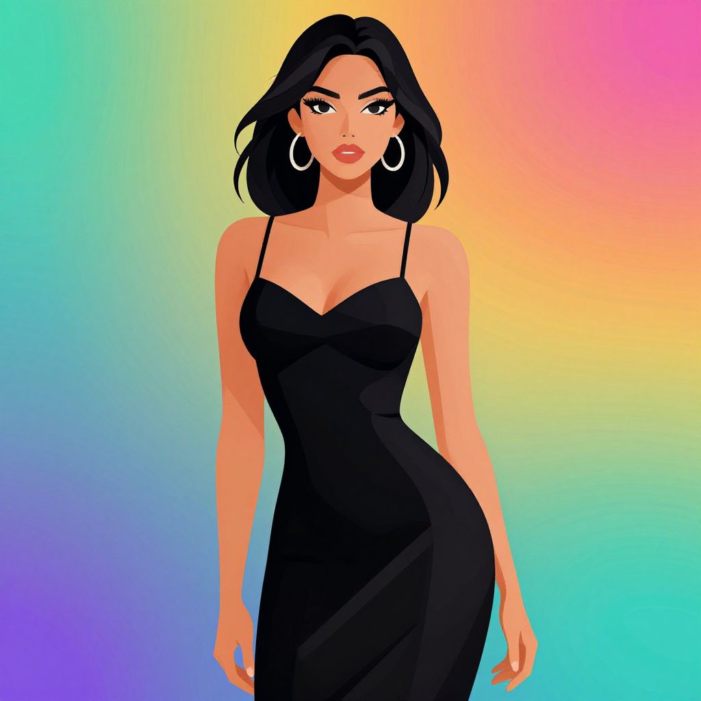 This vibrant illustration features a striking woman with bold makeup and an elegant red dress, set against a colorful city skyline. The artwork combines elements of modern fashion and festive celebration, highlighted by sparkling fireworks that enhance the glamorous atmosphere.