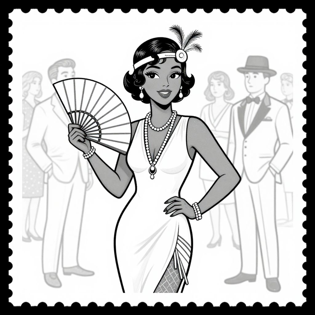 The image is a black and white illustration, likely intended for coloring, featuring a flapper from the 1920s. The central figure is a beautiful black woman with a poised and elegant demeanor. She is adorned in a stylish, flapper-style dress with a low neckline and a fan in her hand, which adds to her sophisticated appearance. Her hair is styled in a classic 1920s fashion, with curls and a headband decorated with a feather. She wears a necklace and earrings, enhancing her glamorous look. In the background, there are two men dressed in formal attire, one wearing a bow tie and a hat, standing near a crowd of people, suggesting a social gathering or party. The overall composition is balanced, with the woman in the foreground and the men and crowd in the background, creating a sense of depth and perspective. The digital stamp cartoon style gives the image a nostalgic and artistic feel, capturing the essence of the 1920s era.