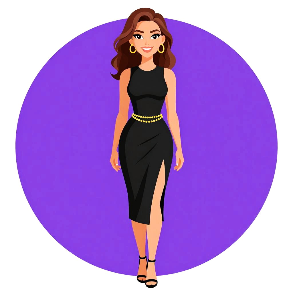 Woman with pretty face and pretty hair. Woman, elegant, black midi bodycon dress, halter top neckline, sleeveless, white embellished waistband, knee-length, black heeled sandals with ankle straps, silver bracelet on left wrist. --sref 1467