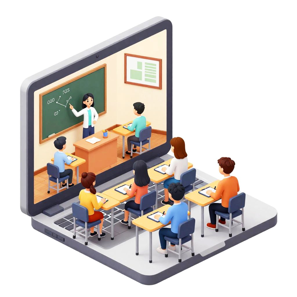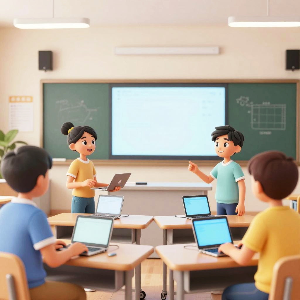 Ai generated tween, sleek modern classroom setting, diverse tween characters interacting with AI devices, bright and airy, clean lines, cartoon style with rich colors, cheerful mood