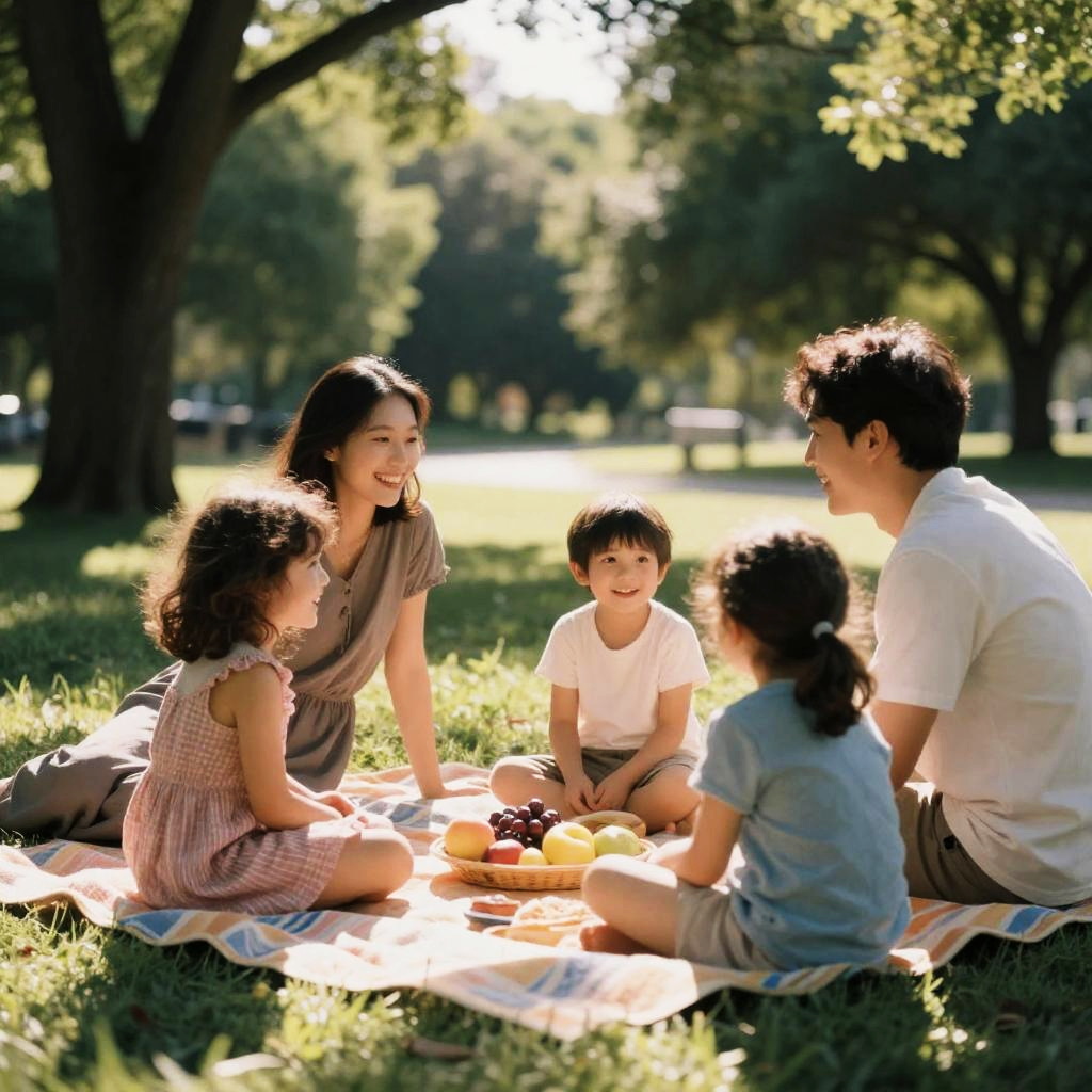 A photograph of an Asian family of five sitting on a colorful picnic blanket in a sunlit park. The mother with long black hair in a gray top, the father with short black hair in a white shirt, two young girls with curly black hair in patterned dresses, and a young boy with short black hair in a white shirt are smiling and enjoying a picnic with a basket of fruits. Trees with green foliage create a dappled sunlight effect in the background. The grass is vibrant green, and the family is positioned centrally, creating a warm, family-oriented atmosphere.