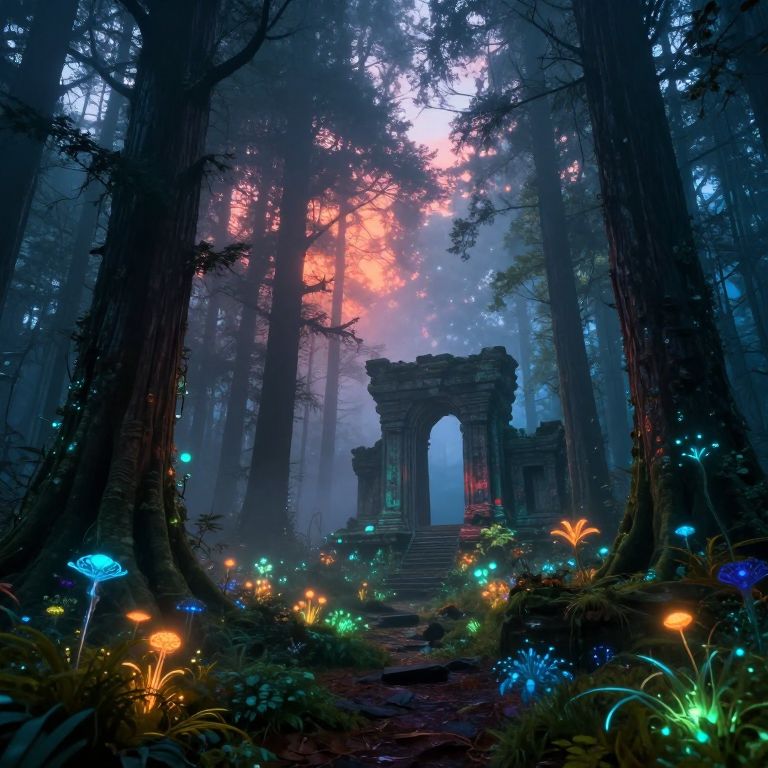 Mwnu, surreal mystical forest scene at dawn, glowing bioluminescent plants and ancient ruins, soft fog weaving through towering trees, ethereal atmosphere, vibrant cool and warm colors, high detail, fantasy art style