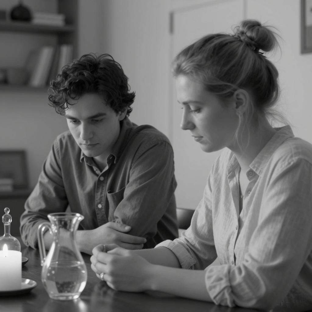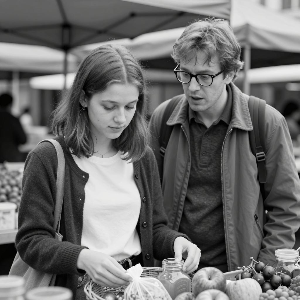 Black and white photo of a young woman with shoulder-length hair wearing a white shirt and dark cardigan, holding a basket while looking down at goods. A young man with light brown hair, glasses, and a jacket stands next to her looking surprised. They are at an outdoor market stall with various fruits and bottled items.
