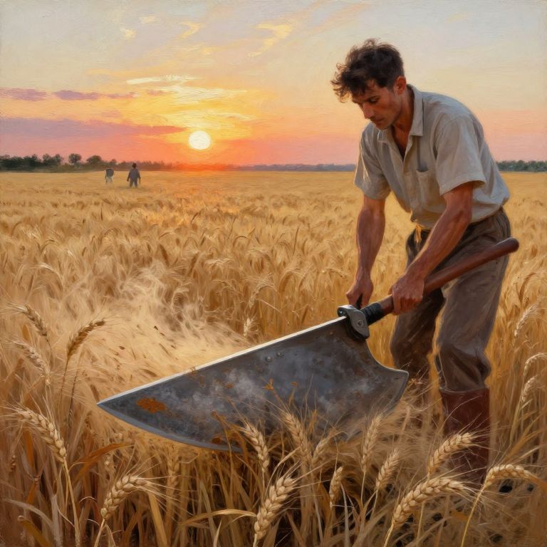 Sickles cutting through tall wheat fields under a bright sunset sky, farmers silhouetted in the distance, vibrant earthy tones, dynamic movement, detailed blades with weathered steel, impressionist painting style