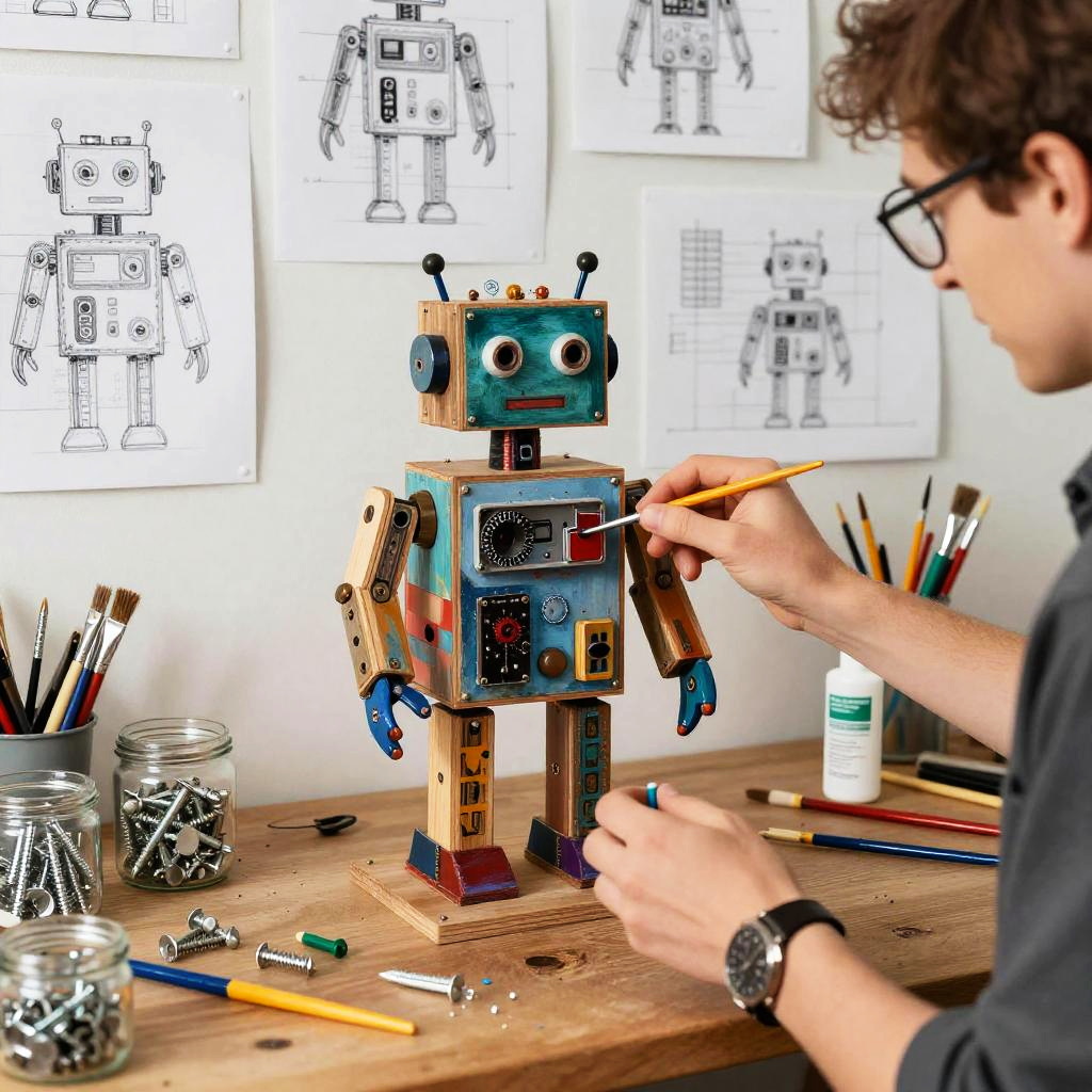 An imaginative bricolage workshop scene with an artist assembling a whimsical robot from recycled electronics, scrap wood, and vibrant paints, surrounded by sketches, blueprints, and jars of screws, brushes, and glue, bursting with creativity and inventiveness.