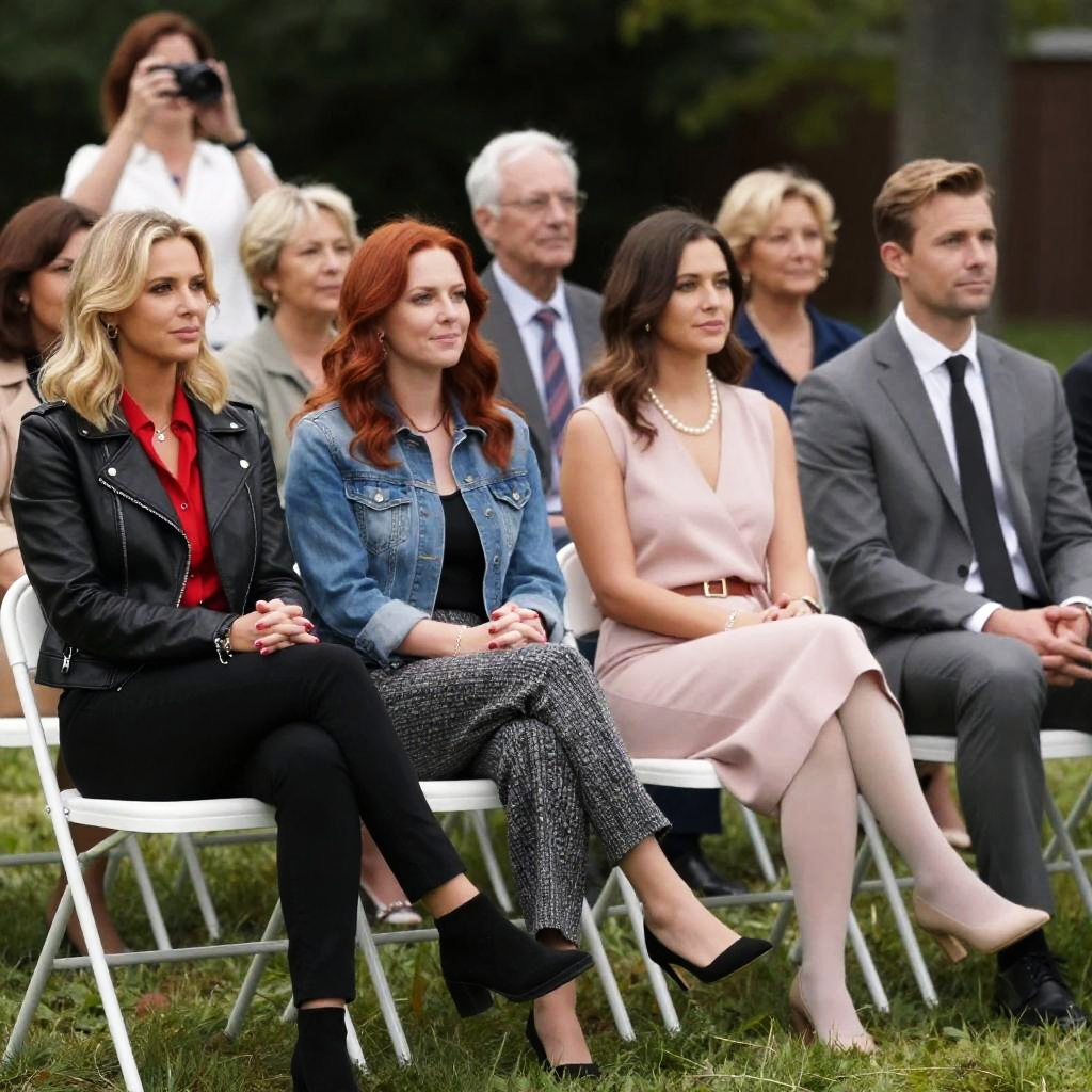 Photograph of six people seated in white chairs on grass, outdoors. Front row: blonde woman in black leather jacket, red shirt, and black pants; red-haired woman in denim jacket, black top, and patterned pants; woman in pink dress, pearl necklace, and white stockings; man in gray suit, white shirt, and black tie. Back row: elderly man in gray suit, several older women in casual attire. Woman in back row taking photo. Casual, relaxed atmosphere.