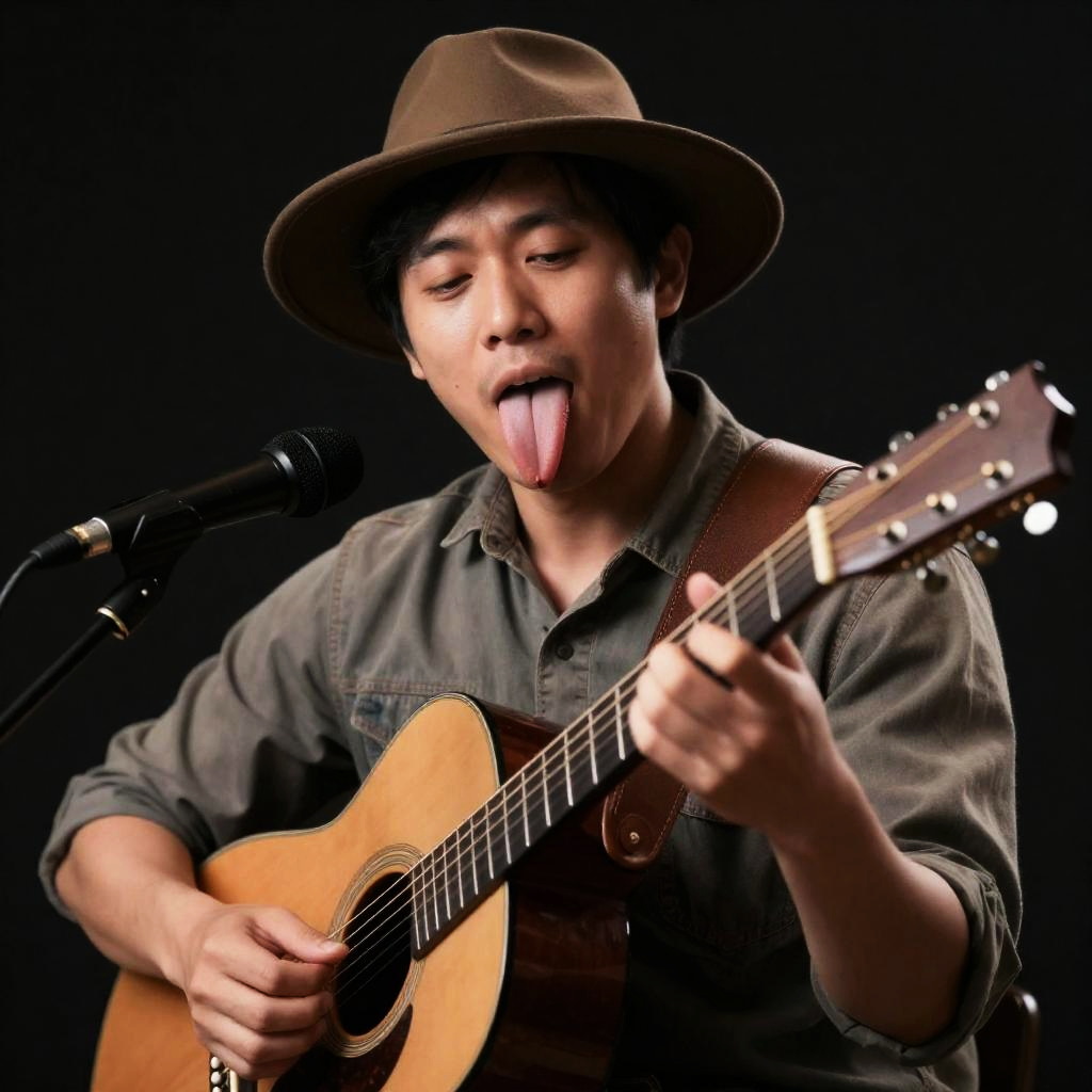 HDR, UHD, 8K, Highly detailed, realistic, photo-realistic:1.37), best quality, masterpiece, maomi, instrument, hat, music, guitar, tongue, solo, playing instrument, open mouth, shirt