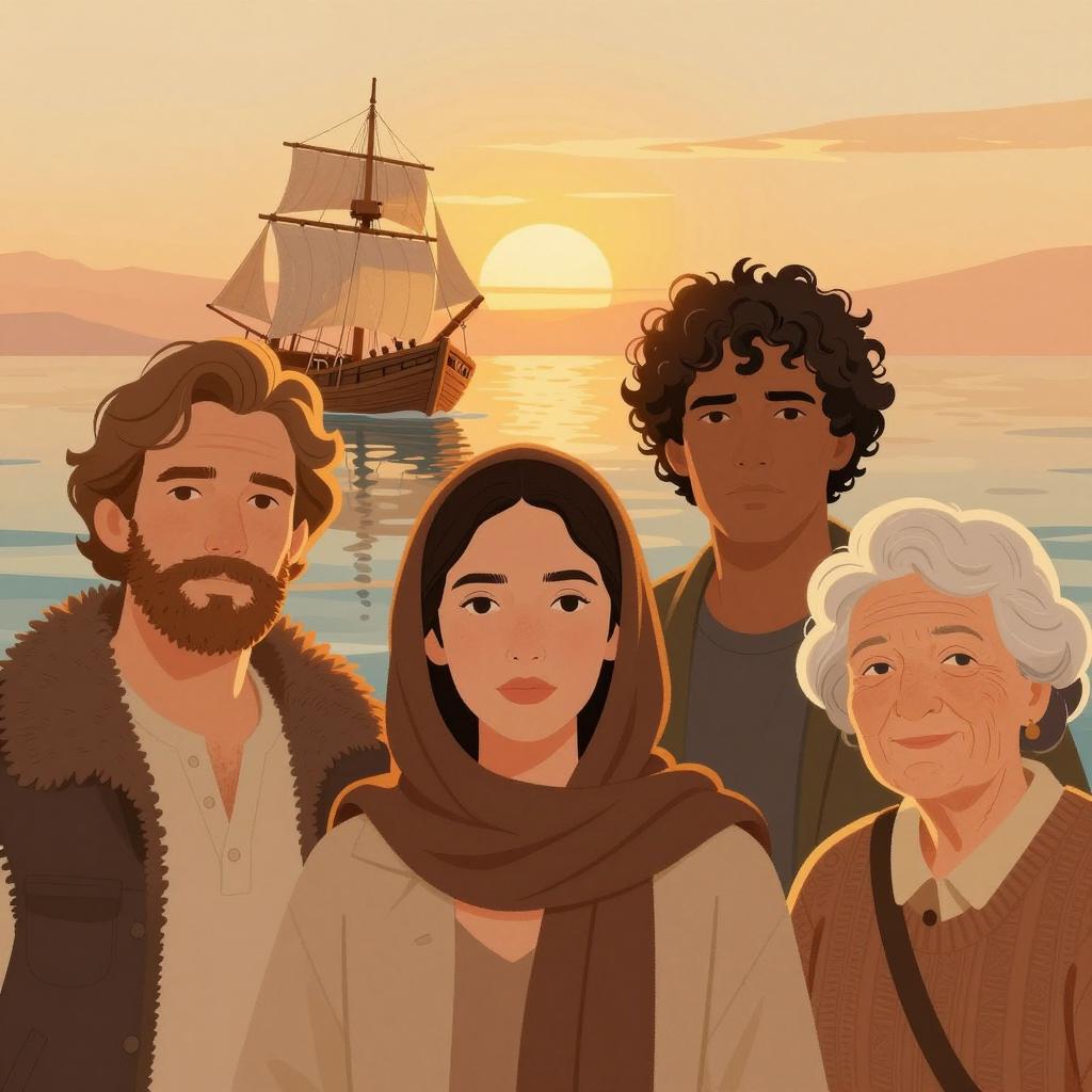Illustration of three people in a desert. An older man with gray hair and a mustache stands behind a woman with long brown hair. A younger man with short black hair and a mustache stands in front. Long, narrow road with sand on both sides stretches into the horizon. Clear sky above. The older man and younger man have focused expressions. The woman looks to the left.
