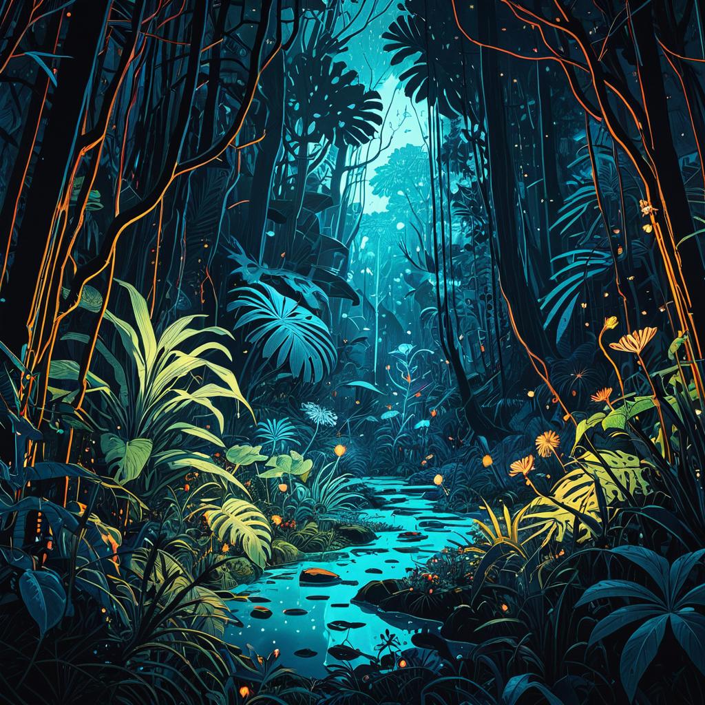 A bioluminescent jungle at night, an ultrafine detailed illustration by James Jean, intricate linework, vibrant hues, vanitas, altermodern, Unreal Engine 5, global illumination, radiant light, detailed environment