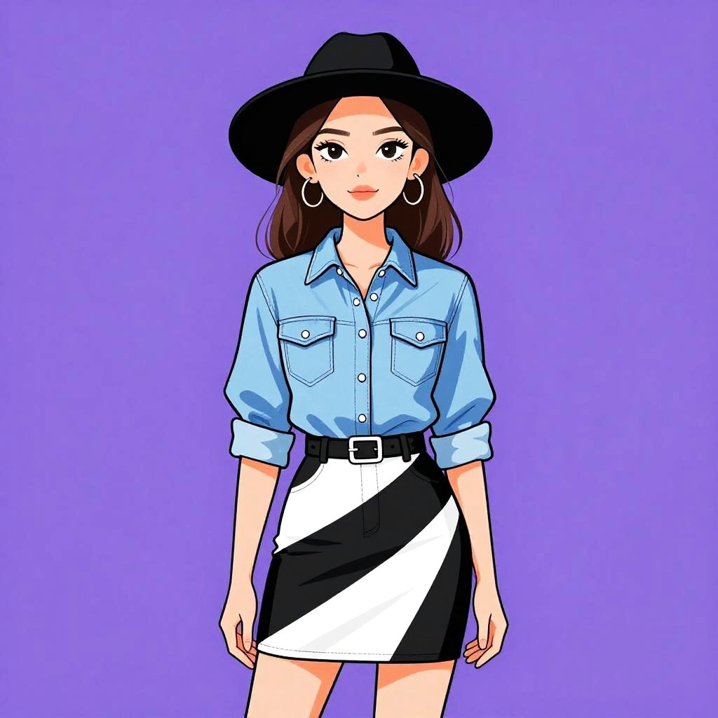 Woman with pretty face and pretty hair. Woman, casual chic, light blue denim button-up shirt, collar, roll-up sleeves, chest pockets, black leather slim belt, geometric black and white mini skirt, wide-brimmed black felt hat. --sref 1467