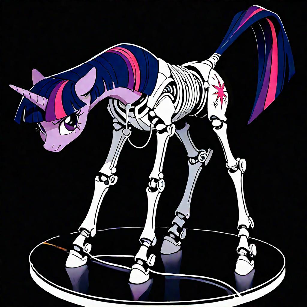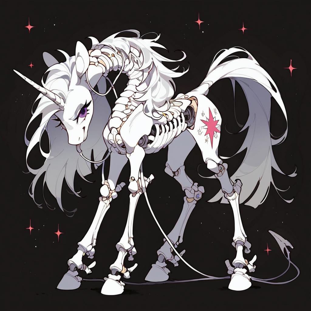 (score_9), black theme, all-black background, full body, character in the center of the screen, solo, (Twilight Sparkle style, tail, mane:1.1), slim waist, electrical wires hanging down, aggressive style, long neck, pony skeleton on a clean black background [skeleton on a black background: source_pony:0.9], exoskeleton without a body, anatomically correct, excellent body symmetry