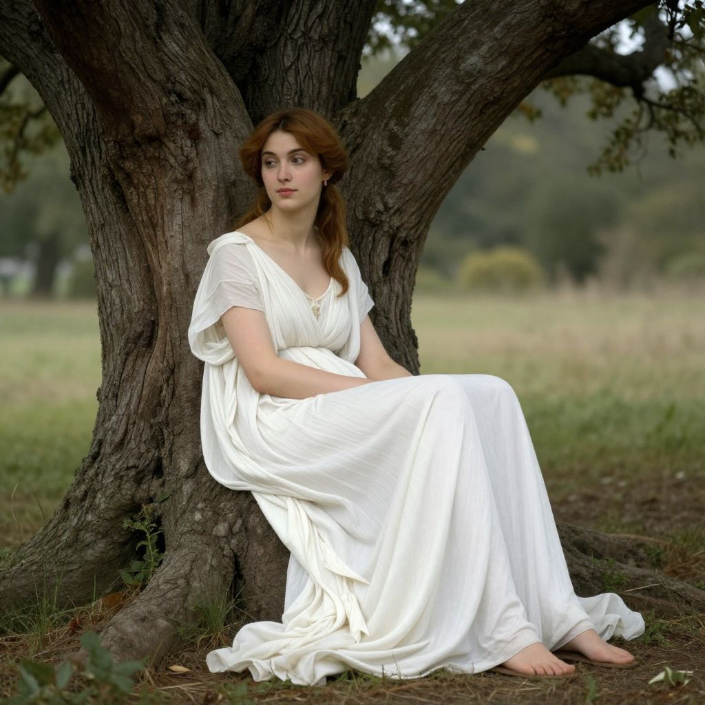 Photograph of a young Caucasian woman with fair skin and long auburn hair, sitting against a large, textured tree trunk in a grassy field. She wears a flowing, white, Grecian-style dress with short, billowing sleeves and a deep V-neck, barefoot on the ground. Her expression is thoughtful, gazing slightly to the left. The background features blurred greenery and a soft focus on the horizon, creating a serene, natural setting. The lighting is natural, highlighting the white dress and her serene presence. The image conveys a timeless, classical aesthetic.