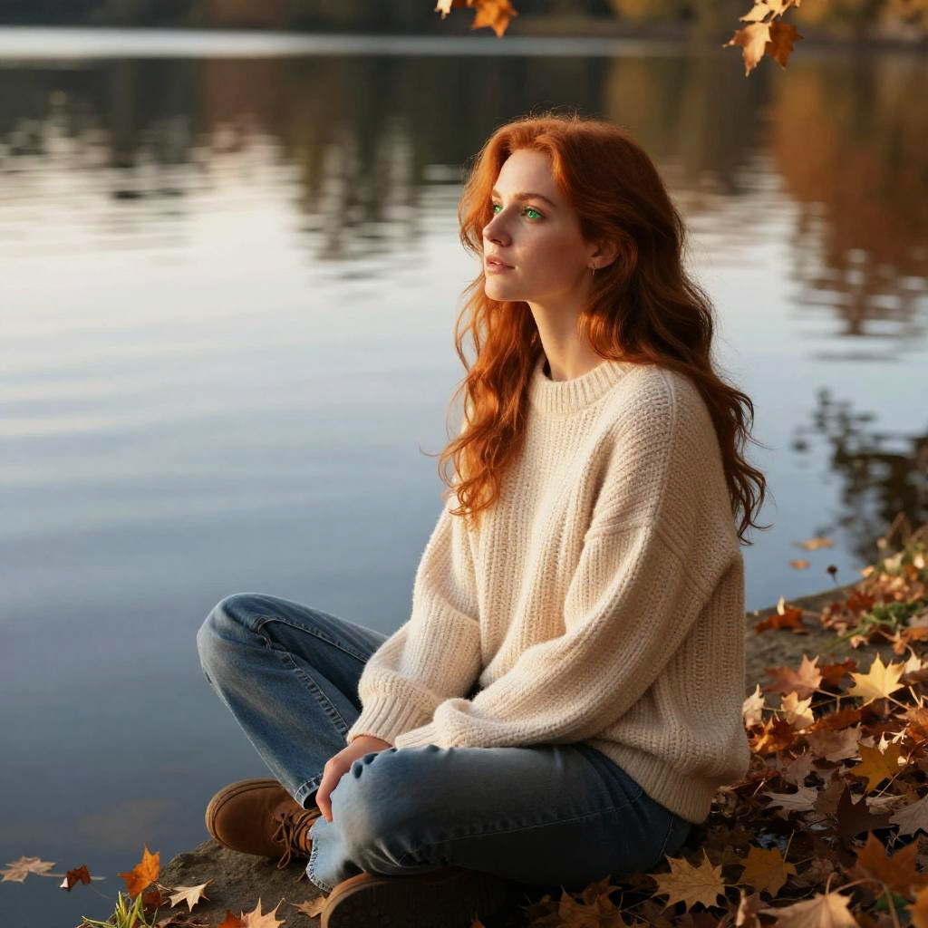 A red hair green eyes woman sitting by a tranquil lake during autumn, leaves falling around her, reflective water mirrors her serene expression, cozy knitted sweater, soft golden hour lighting, calm and peaceful mood, hyper-realistic detail