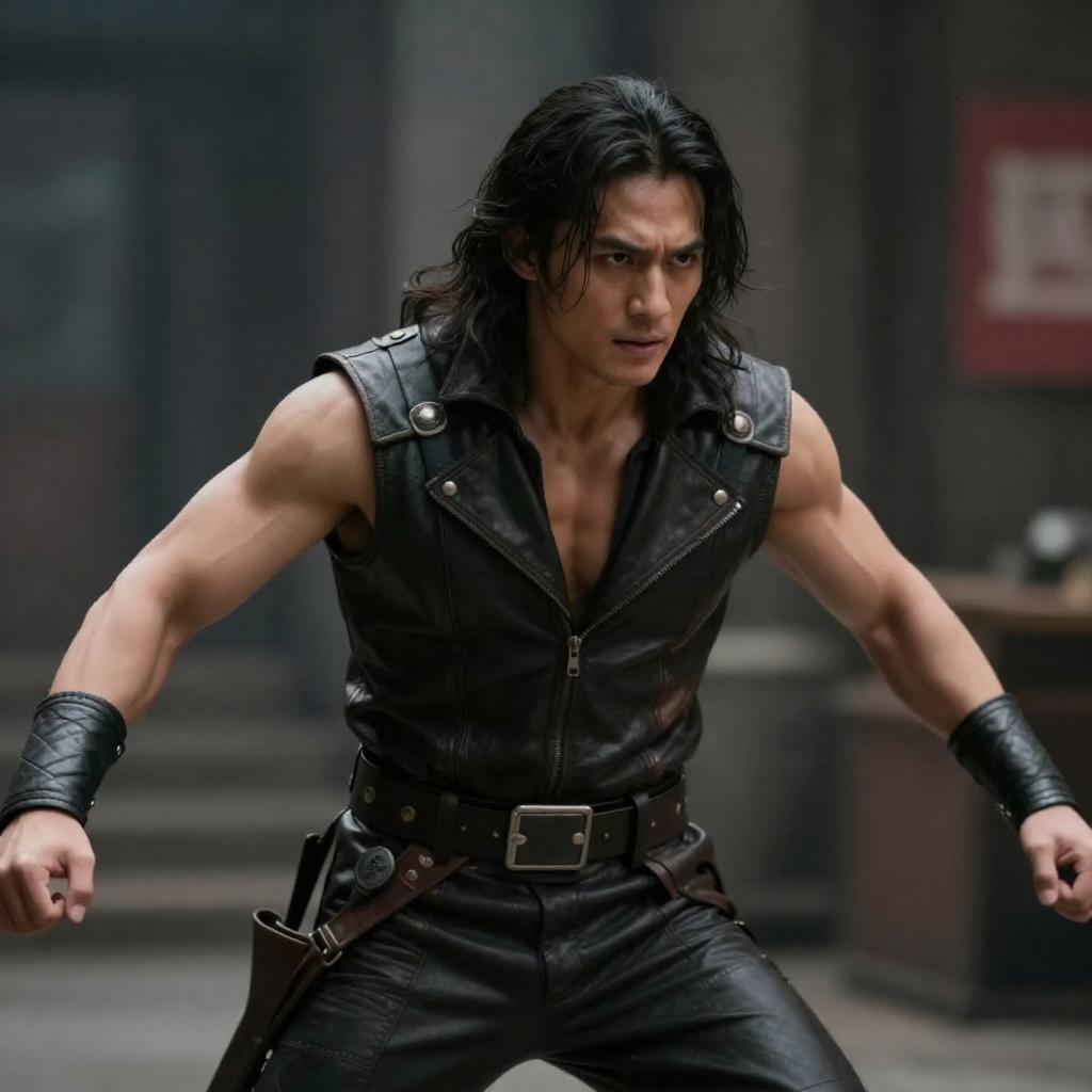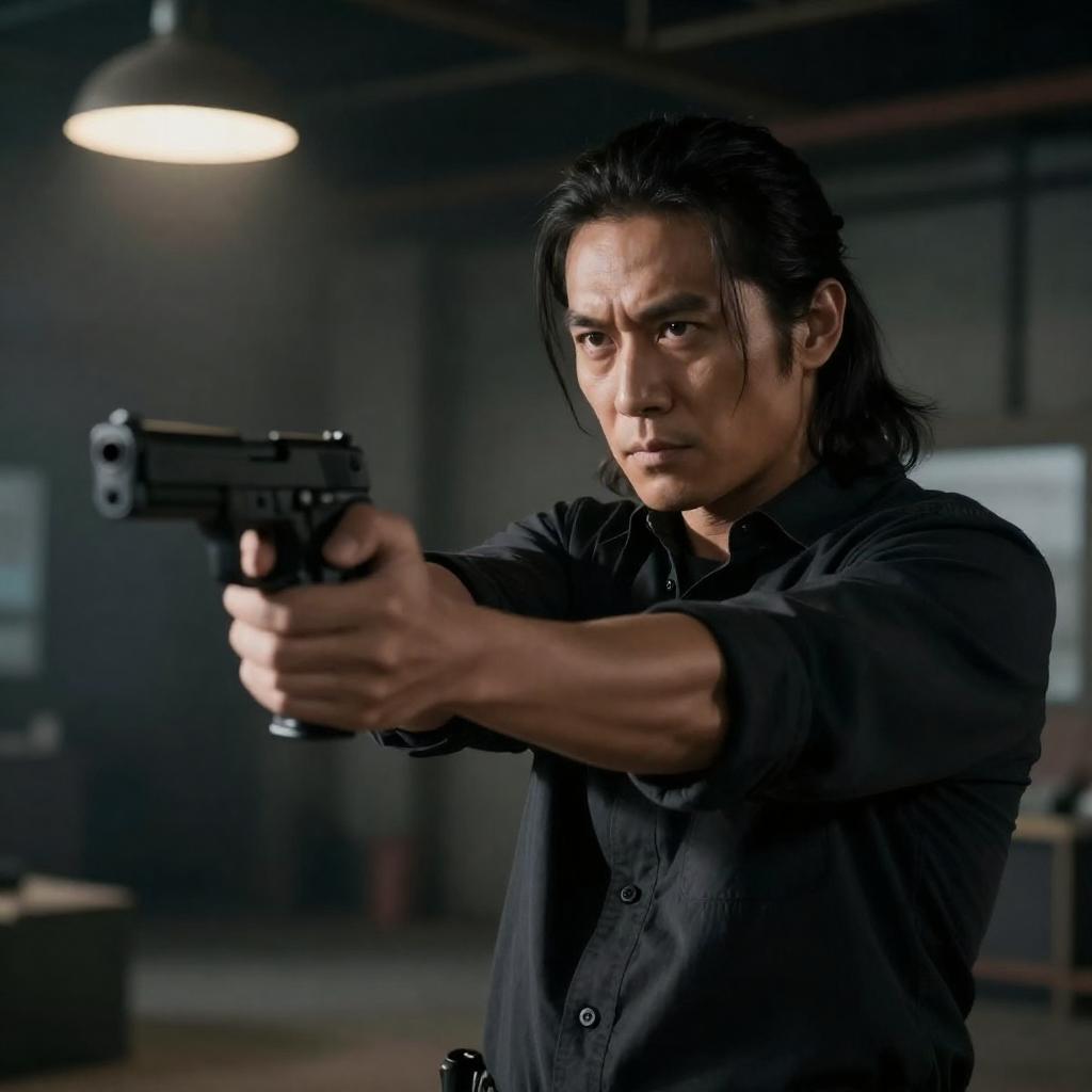A dark, intense cinematic scene featuring a man with long black hair and a serious expression standing at the center. He is dressed in a dark jacket and shirt. Two shadowy figures in tactical gear stand behind him holding flames in their hands, creating a dramatic and fiery atmosphere. The background is dimly lit with smoke and fire emphasizing the suspenseful mood.