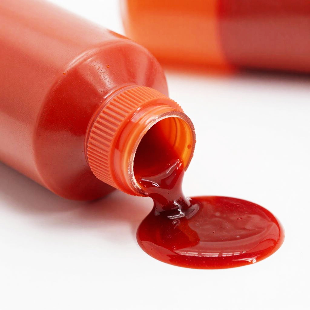 Close-up image of a bright red, glossy plastic squeeze bottle tipped over on a white surface, with thick red sauce spilling out. The spilled liquid is smooth and viscous, creating vibrant contrast against the clean white background. The background features a soft warm orange and red gradient blur, adding depth to the composition.