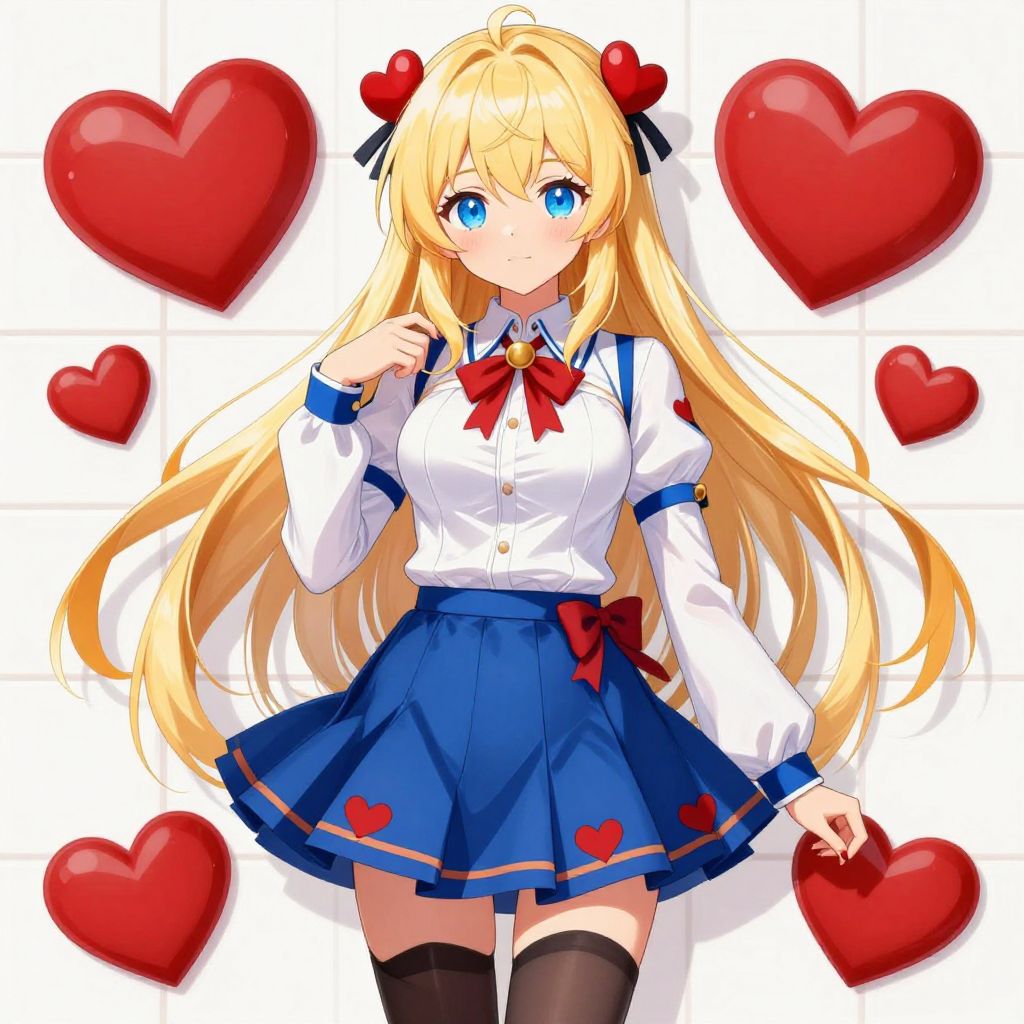 Illustration of an anime-style female character with very long blonde hair and blue eyes, wearing a white collared shirt with blue accents and a red ribbon. She has large breasts and a blue pleated skirt adorned with red heart details, paired with black thigh-high stockings. The character has heart-shaped hair ornaments and painted nails, standing against a tiled background featuring glossy red heart shapes.