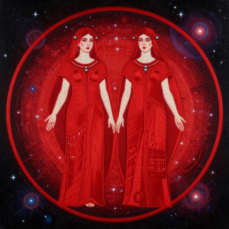 Digital drawing of two identical women with fair skin, red hair, and blue eyes, standing side by side against a cosmic background. Both women wear long, red, ancient Greek-style dresses with geometric patterns, each adorned with a blue gemstone at the neckline. They hold hands, with arms slightly outstretched. The background features a dark, starry sky with glowing red and blue nebulae, framed by a large red circular design. The women's expressions are serene, and their hair is styled with simple headbands. The overall style is vibrant and surreal, blending ancient and cosmic elements.