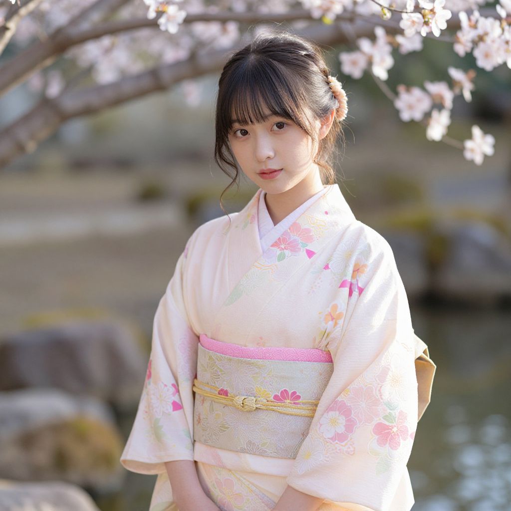 Kimono cute young woman in peaceful Japanese garden, soft pastel colors, intricate floral patterns on kimono, gentle sunlight, serene expression, delicate blossoms around