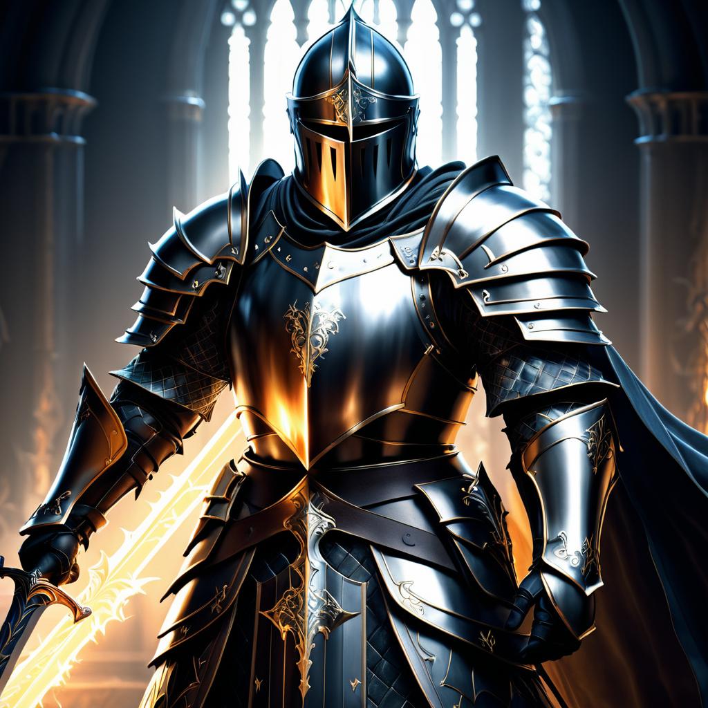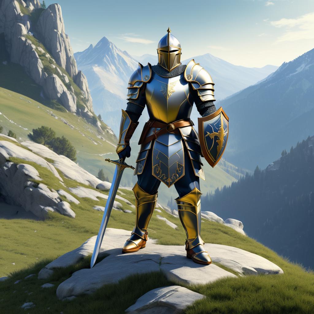 Digital illustration of a valiant knight in full shining armor standing on a rocky outcrop amidst a mountainous landscape. The knight is fully armored with a steel helmet, chest plate, gauntlets, and greaves, holding a detailed sword with a golden hilt. The background features high cliffs and green valleys under a clear sky, emphasizing a medieval fantasy setting.