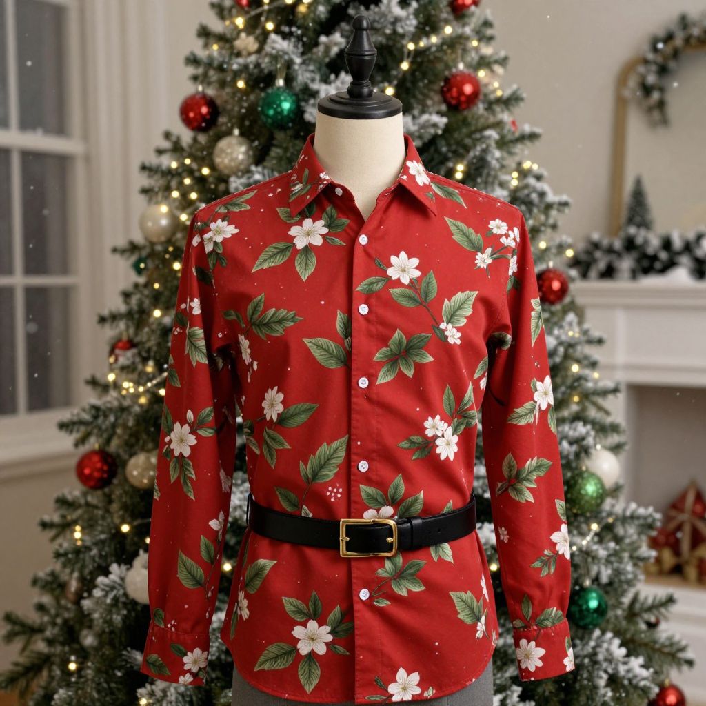 A mannequin standing in front of a beautifully decorated Christmas tree, wearing a red shirt adorned with green leaves and white flowers that bloom across the fabric, adding a festive and natural touch. The shirt features a black belt with a sleek gold buckle, giving it a polished and elegant look. The mannequin is posed upright and centered, facing the viewer, with soft winter lighting casting gentle shadows. The background shows a cozy, winter-themed environment with twinkling lights, snowfall, and a classic Christmas tree with red and green ornaments, creating a warm and inviting atmosphere.