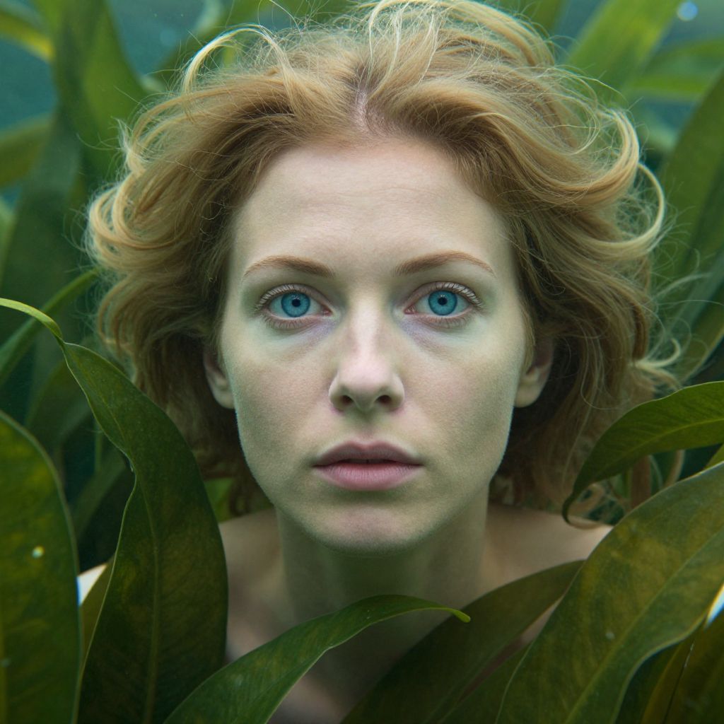 Craft a photorealistic portrait of an enigmatic European woman with striking blue eyes exuding curiosity and wisdom as she stands surrounded by lush green foliage. Capture this scene from a unique underwater perspective, illuminating her porcelain skin and golden hair in an ethereal glow that highlights every intricate detail. This ultrarealistic image should evoke a range of emotions from tranquility to awe, inviting viewers to immerse themselves in the captivating presence of this subject while pondering the secrets hidden within her expressive eyes.