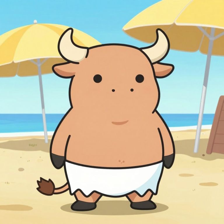A cartoon bull wearing a loincloth stands on a beach with a yellow umbrella and a person in the background.