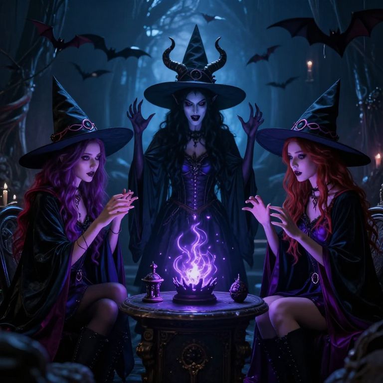 Three enchanting witches in revealing attire, with neon accents, gather in a dark, eerie room, summoning a demon amidst a crowd of bats.